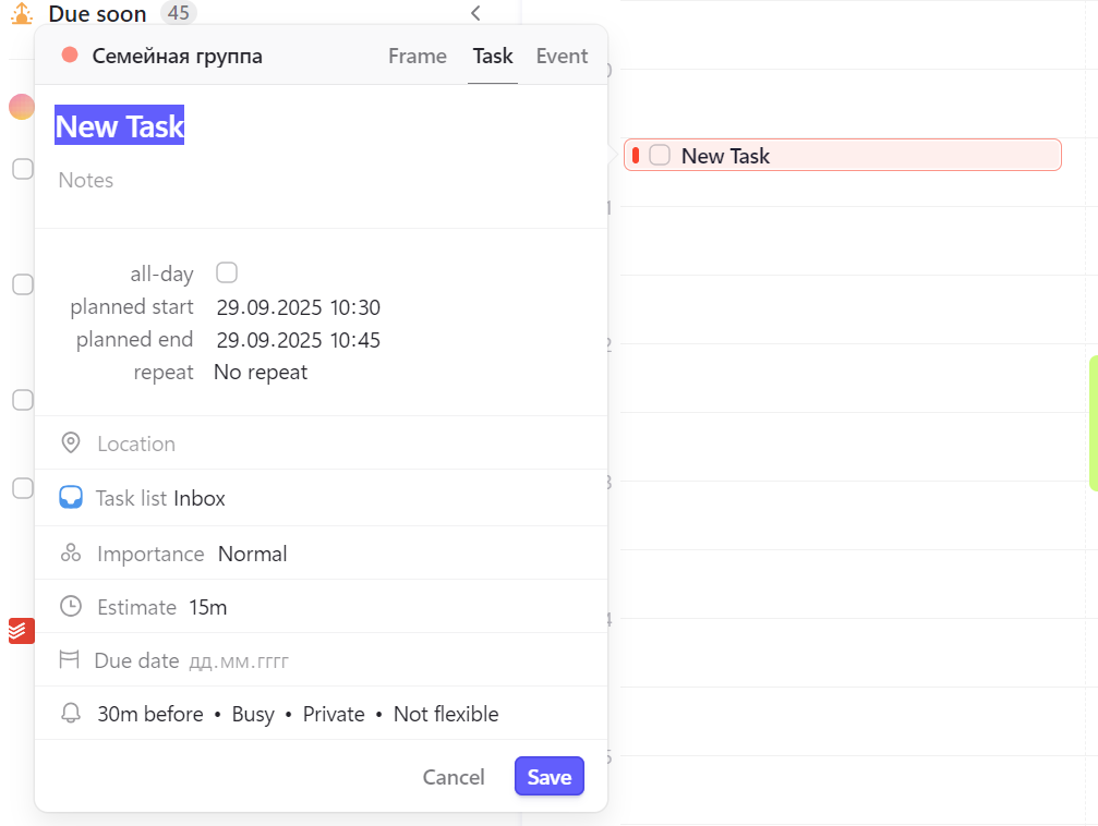 Но при создании новой задачи вы уже вправе редактировать всё. Можно выбрать длительность, дату начала и окончания, повторяемость, добавить гео, важность и многое другое.
