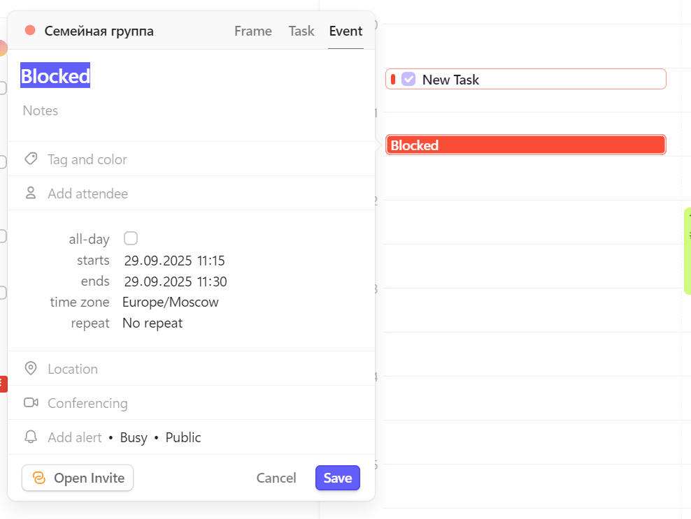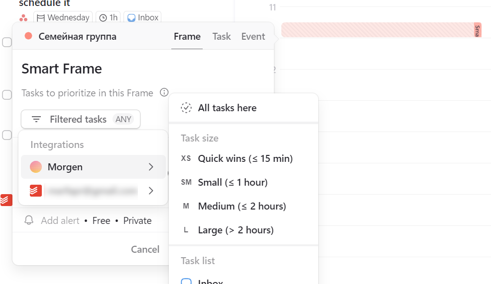 Кроме этого, в morgen есть такая штука, как Frame. Аналогов которой я не видел нигде. По сути, вы в календаре выделяете блок времени, во время которого вы будете работать над задачами. И в этот блок добавляете задачи.