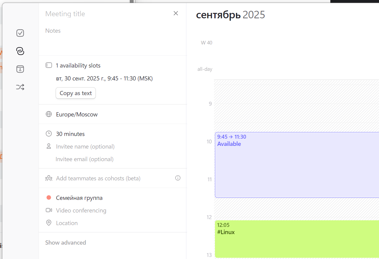 Время слота, участники (если нужны), ссылка на встречу и локация. В дополнительных параметрах можно указать срок, до которого можно занять указанный слот, и необходимость проверки вашей занятости по одним или нескольким календарям.