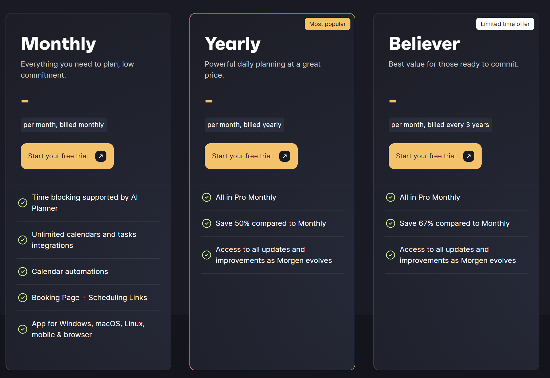 Понять, сколько же стоит morgen, сложновато, т.к. на главной странице информации о стоимости нет. А сами тарифы отличаются только по сроку подписки.