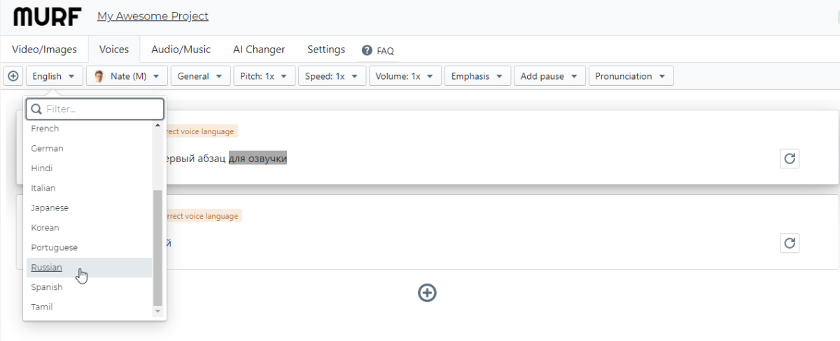Язык набранного текста распознаётся автоматически. При этом в Murf язык для озвучки по умолчанию стоит английский, и он не будет изменён для вашего текста.