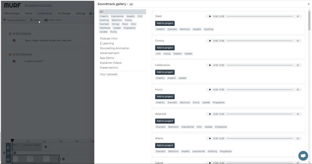 Аналогичным образом работает добавление музыкальной дорожки на вкладке Audio/Music. Но в Murf есть своя галерея треков для популярных задач, вроде интро для подкаста или весёлой фоновой музыки.