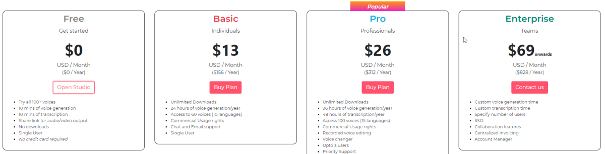 Разблокировать все возможности можно за $13 в месяц. В зависимости от выбранного плана меняется лимит доступной длительности озвучки, а также добавляется возможность совместной работы.