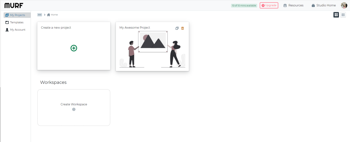 Вся работа в Murf ведётся в так называемой студии. Здесь вы можете создавать новые проекты и распределять их по рабочим пространствам, а также использовать один из предустановленных шаблонов.