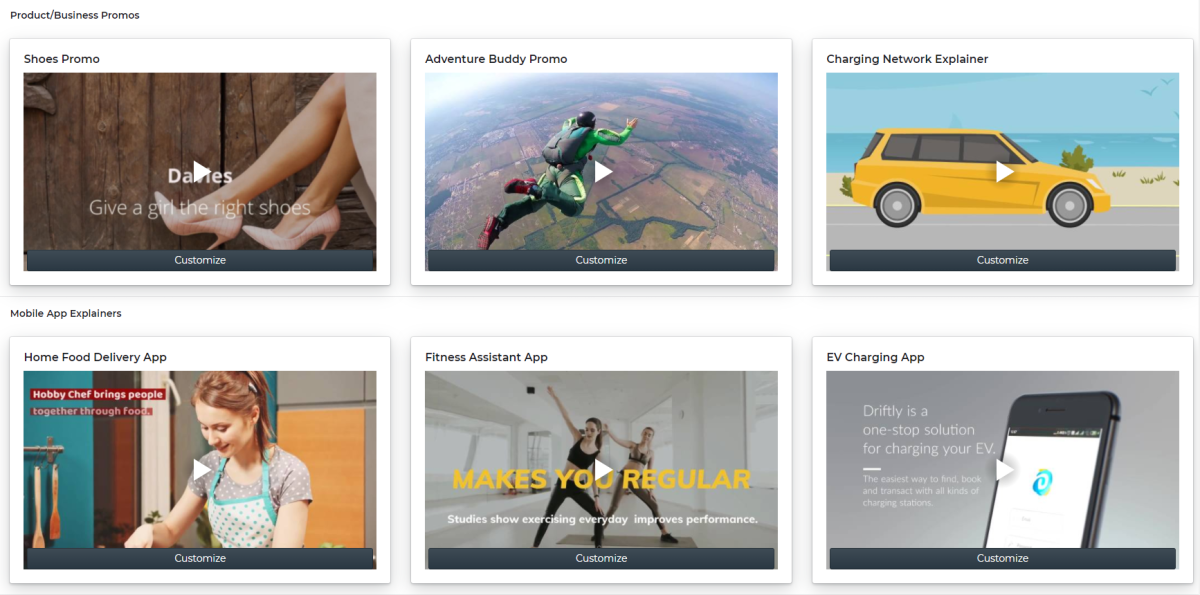 Шаблонов, к сожалению, не очень много. На момент написания поста их было всего двенадцать штук с разбивкой по категориям: промовидео, обучающие видео по приложениям, презентации и интро к подкастам.