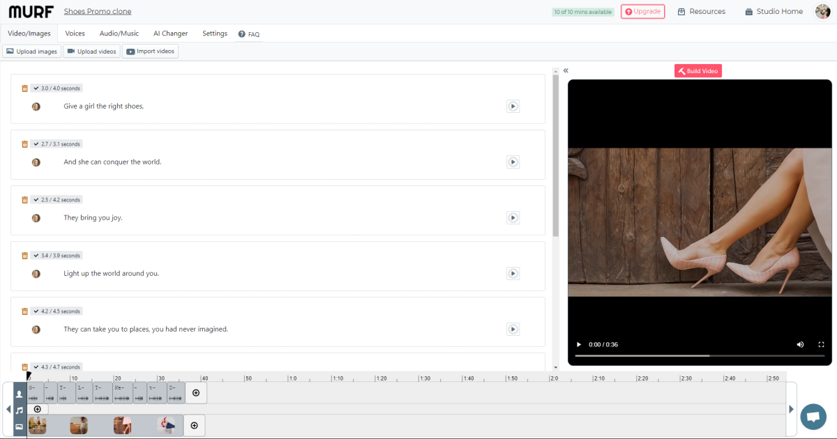 На вкладке Video/Images можно загрузить собственные видеофайлы и картинки, которые будут служить видеорядом для будущего проекта. К сожалению, видеоредактора в Murf нет, и максимум вы можете изменять длительность видеофрагментов.