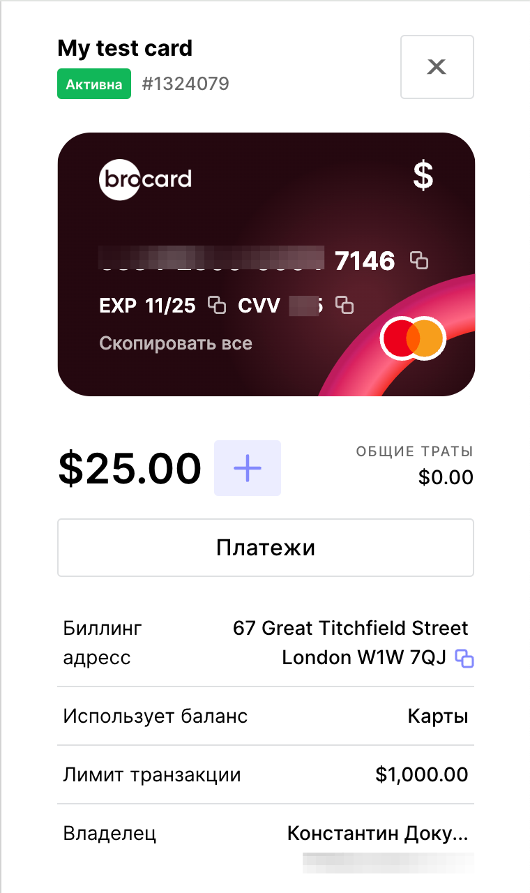 При нажатии на название карты можно увидеть платёжную информацию, биллинг адрес. Отсюда же можно приостановить работу карты, удалить её или изменить её параметры.
