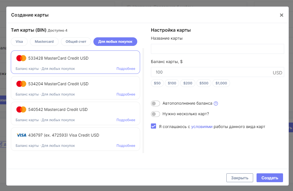 После выбора нужной карты вы можете дать ей собственное название, чтобы её было проще отслеживать в личном кабинете, указать начальный баланс карты, активировать автопополнение баланса и выпустить сразу несколько карт (до 20 штук).
