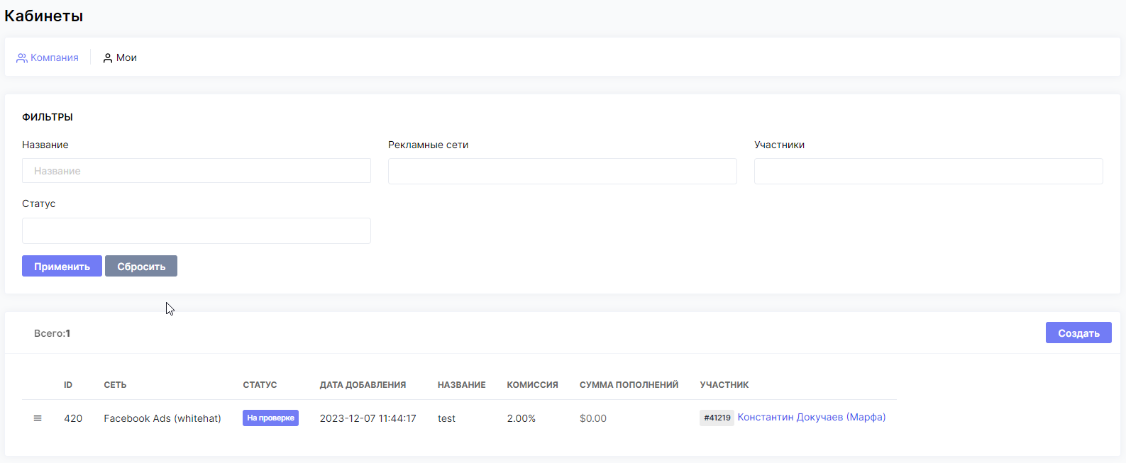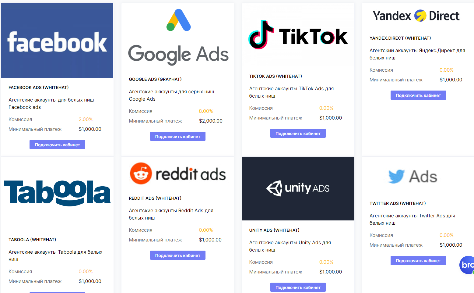У каждого кабинета есть короткое описание, процент комиссии и минимальный платёж. Подключённые кабинеты и кабинеты на модерации отображаются в отдельной вкладке.