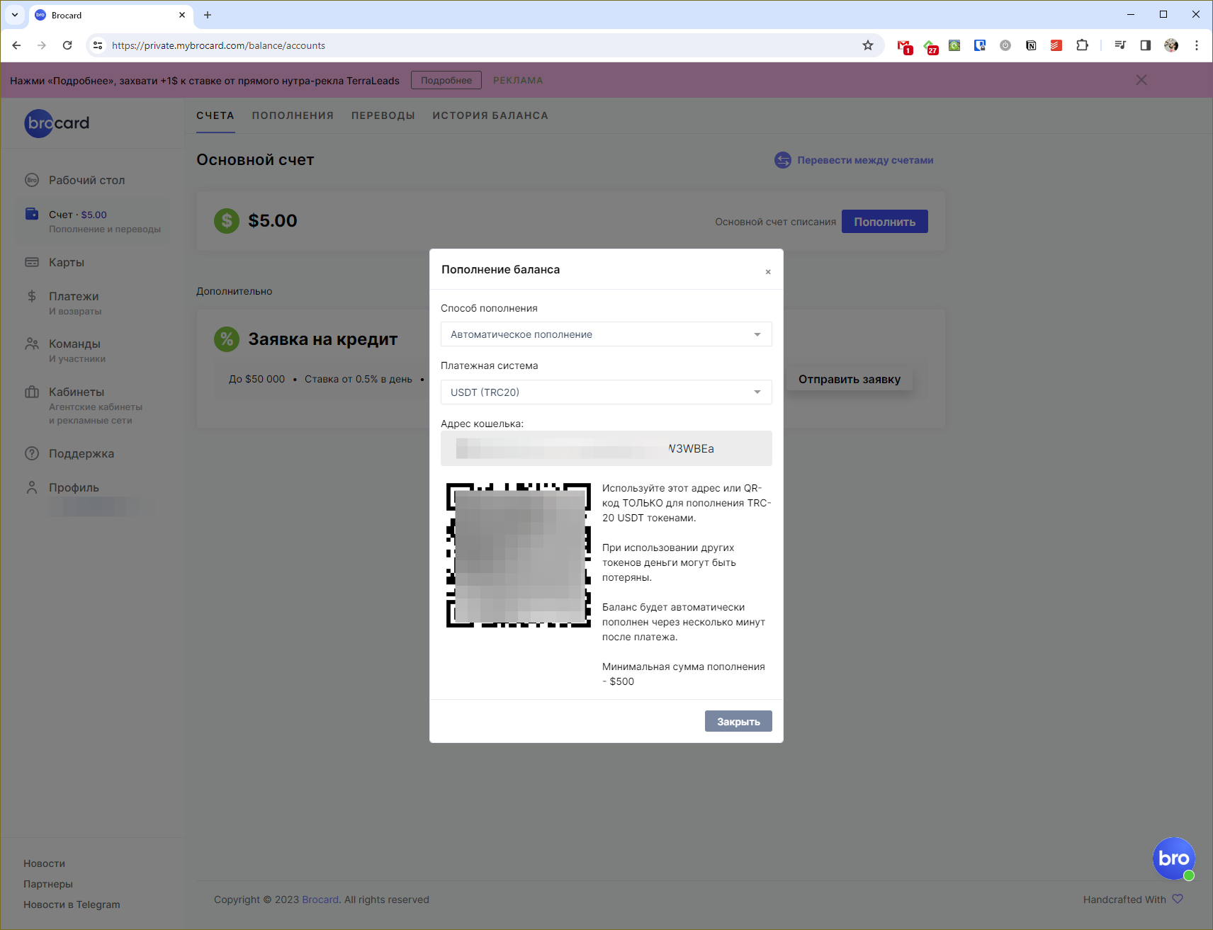 Взять и просто начать пользоваться сервисом у вас не получится. Для работы с личным кабинетом и выпуска карт нужно внести депозит в размере $500 на баланс.