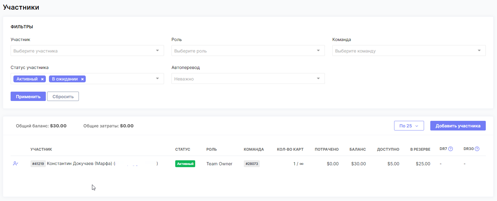 По каждой команде или участнику можно посмотреть платежи, доступные карты, общие затраты и баланс, decline rate за недели и месяц.
