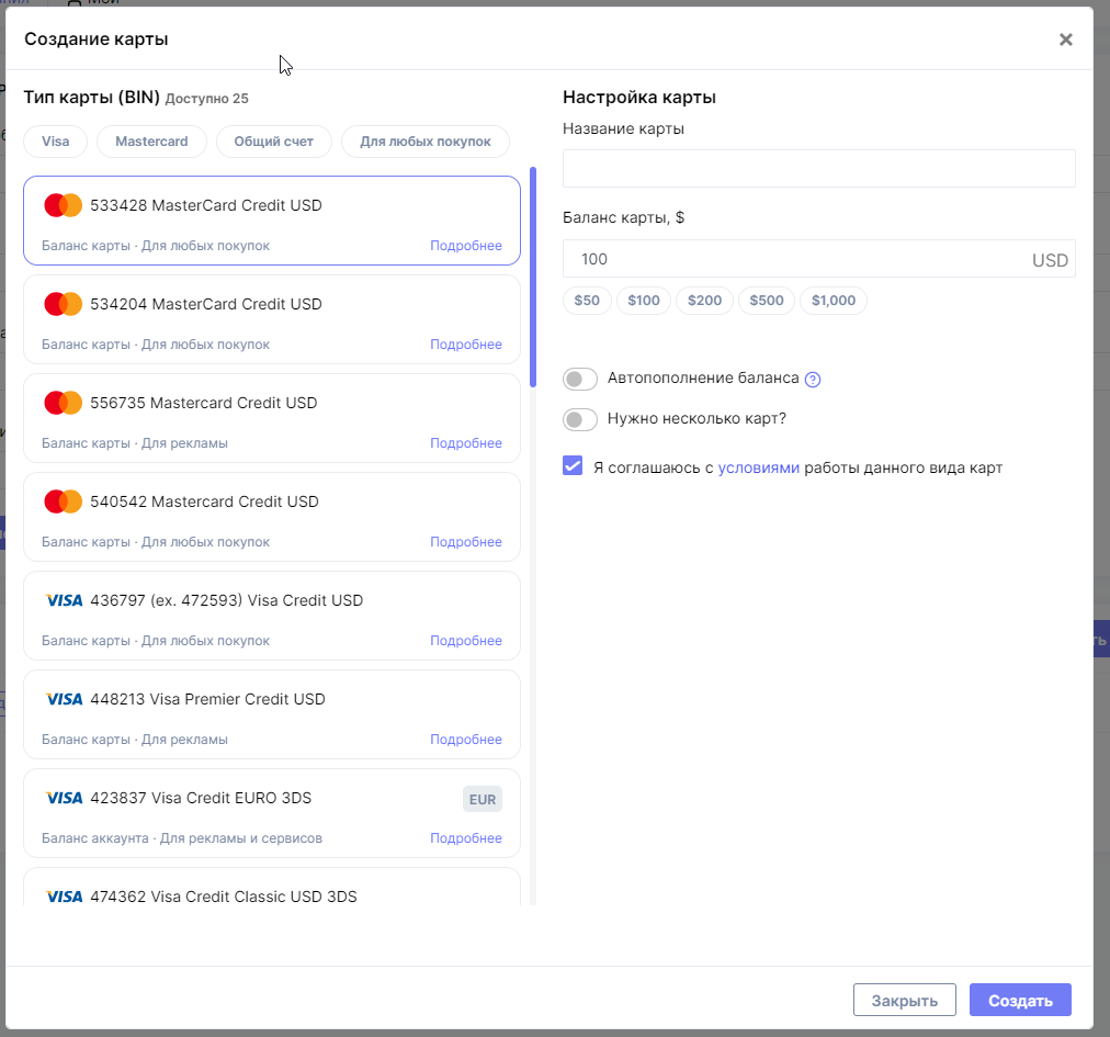 Выпуск карт осуществляется в разделе Карты. На момент написания статьи MyBrocard предлагает 25 BIN’ов. Для более удобного выбора подходящей карты можно отфильтровать результаты по Visa или Mastercard, наличию общего счёта и возможности оплачивать любые покупки.