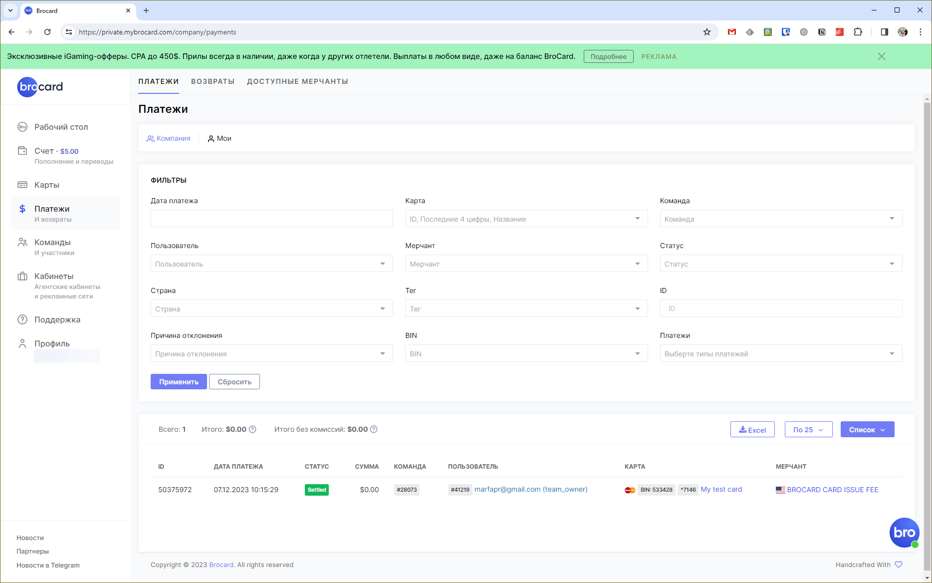 В итоге вы попадёте в полноценный рабочий кабинет, из которого сможете управлять своими картами, просматривать транзакции, работать в команде и с рекламными кабинетами.