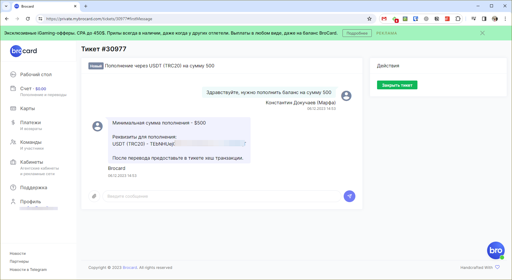Для этого нужно открыть тикет с техподдержкой, в котором вы получите реквизиты для пополнения. Пополнить баланс можно с помощью USDT (TRC-20, ERC-20), Wire и Capitalist. Также баланс можно пополнить напрямую из партнёрки.