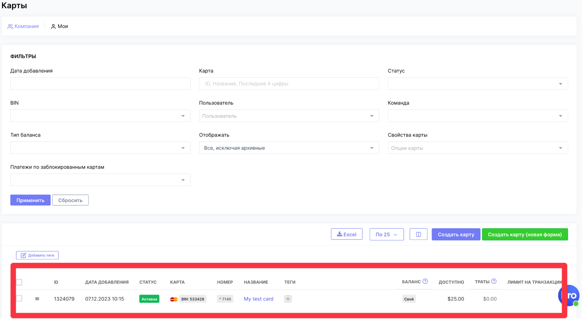 Карты активируются мгновенно и отображаются в текущем разделе. В отличие от шага с выпуском, в этот раз у вас есть уже полноценный фильтр для отображения карт. Можно искать карты по члену команды, типу баланса, платежам и многим другим параметрам.