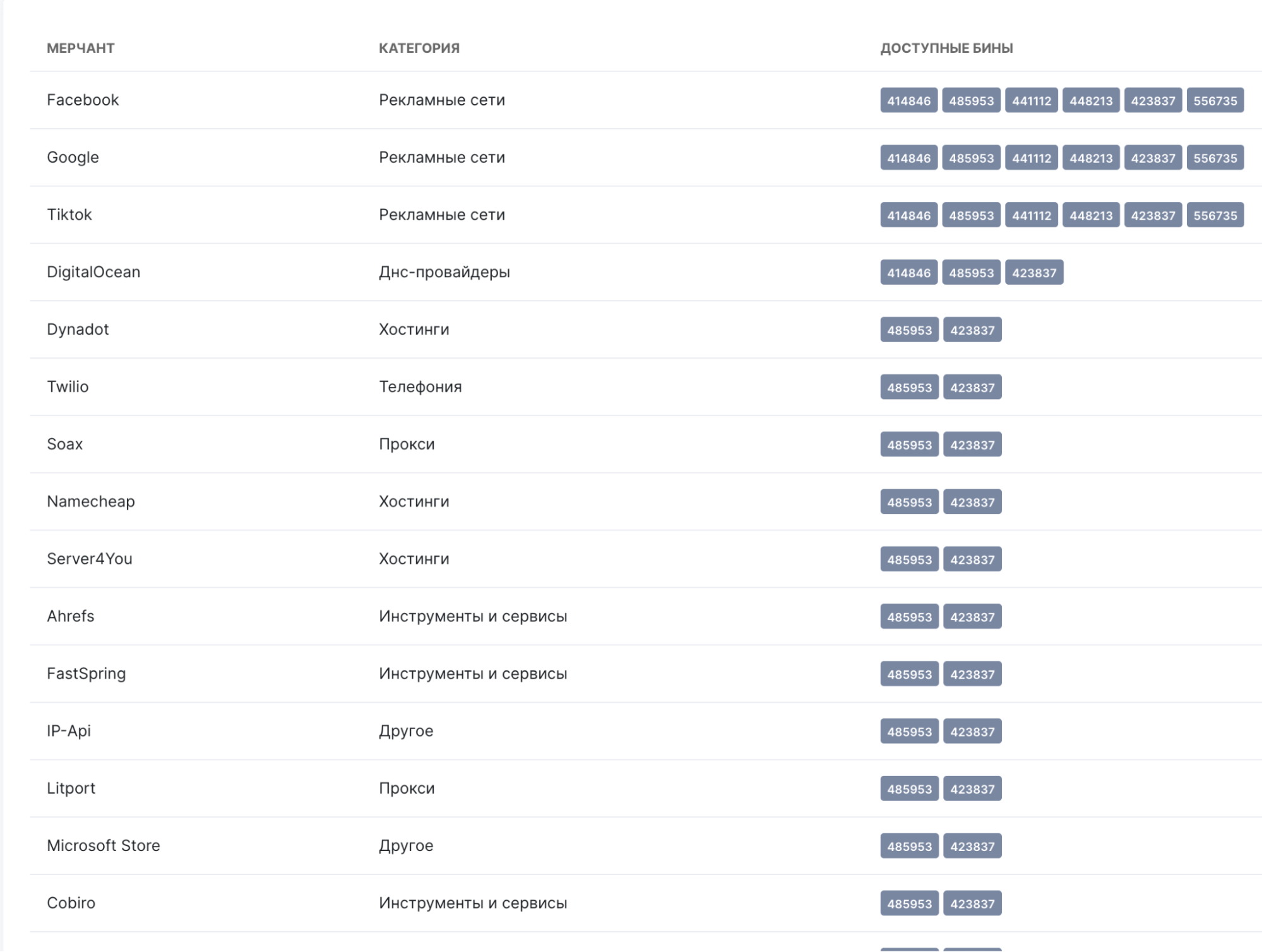 Про список мерчантов скажу отдельно. В этом разделе можно увидеть, какими БИНами какие рекламные кабинеты можно оплачивать. Сюда будет полезно заглянуть ещё до выпуска первой карты, чтобы точно выпустить подходящую.