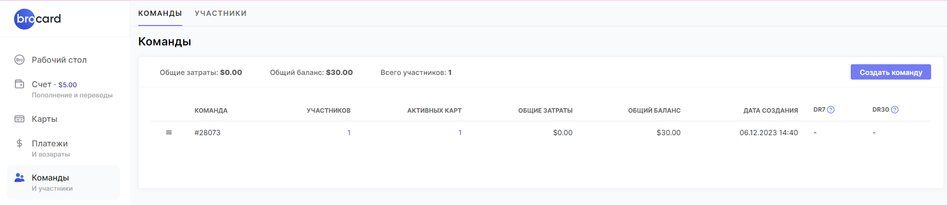 В разделе Команда можно управлять сотрудниками и уровнями их доступа к картам. Можно отдельно просматривать все команды и участников. Да, в MyBrocard можно создать больше одной команды.