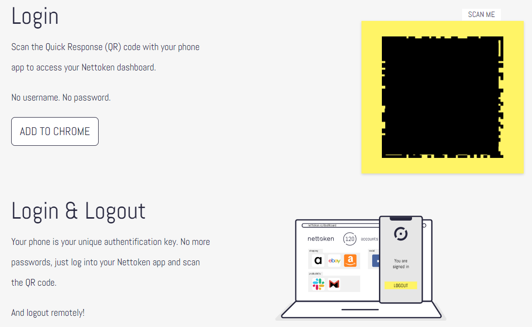 Nettoken состоит из сайта и приложения для Android и iOS. Для авторизации или регистрации на сайте с помощью мобильного приложения нужно отсканировать QR-код.