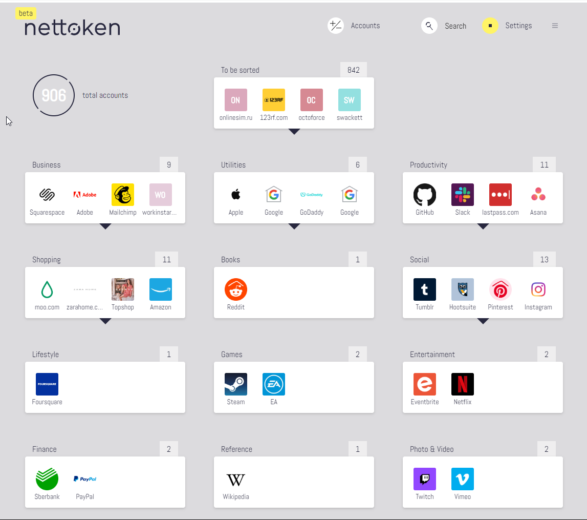 В своём менеджере паролей я уже давно забил на группы и папки, и пользуюсь поиском. В Nettoken он тоже есть.
