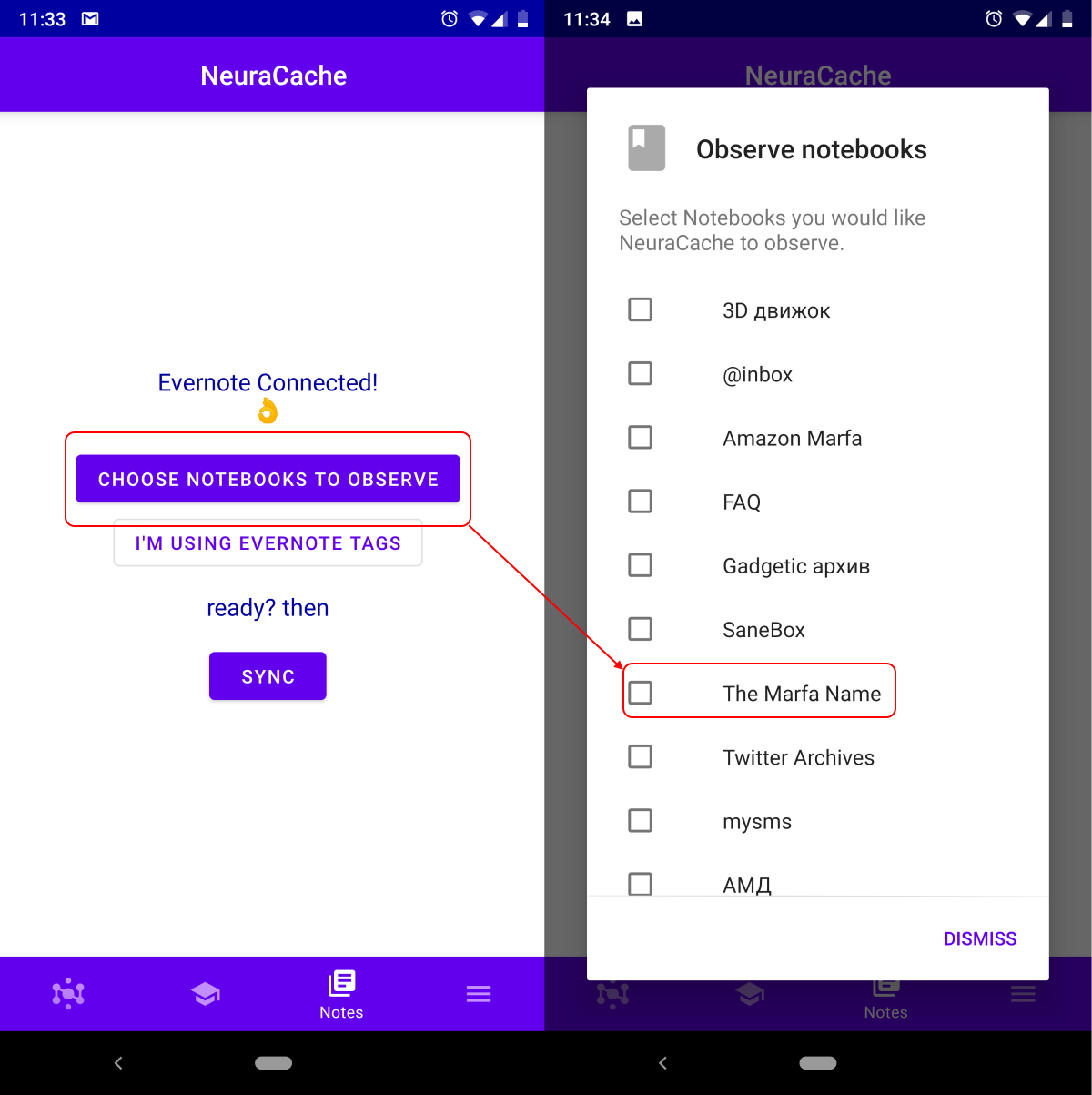 Затем нужно нажать Sync и подождать завершения первой синхронизации. В дальнейшем все подходящие под эти условия заметки сами будут добавляться в NeuraCache.