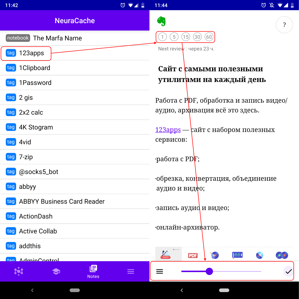 После синхронизации нужно выбрать теги или заметку-карточку и указать через какие интервалы в днях вы хотите получать напоминания о ней. Либо можно оставить всё как есть и программа автоматически запустит обучение с параметрами по умолчанию.