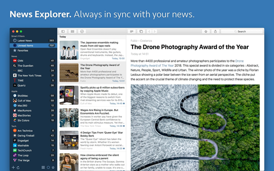 Программа для чтения RSS-новостей News Explorer — это уникальная возможность собрать в одном месте любимые сайты, блоги, каналы и даже подкасты. Тем, кто пользуется приложением, нет необходимости кочевать по всем ресурсам, да ещёи тратить время на закрытие всплывающих окон, вынужденный просмотр рекламы и прочие вещи, мешающие наслаждаться чтением интересных материалов.