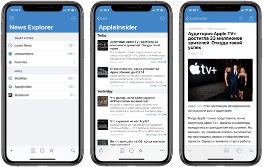 News Explorer – десктопная читалка RSS, Atom, JSON и Twitter лент для macOS, iOS, Apple TV и Apple Watch с поддержкой синхронизации, папок и много другого.