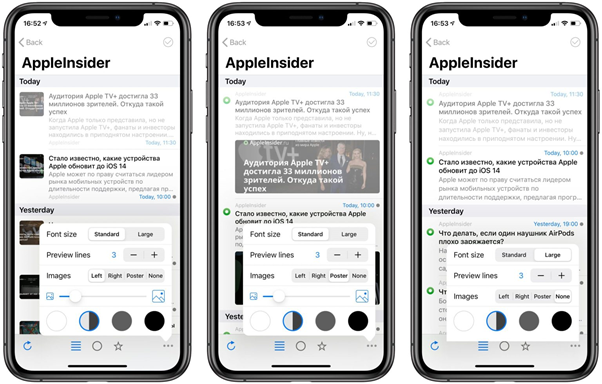 Дизайн тот же, но в мобильной версии разделы с подписками/папками, списком статей и окном для их прочтения можно просматривать лишь по отдельности.