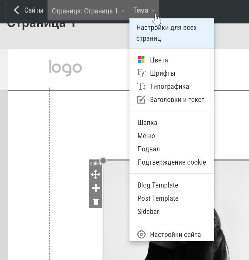 Чтобы не настраивать каждый элемент по отдельности, можно установить настройки темы. Здесь можно указать цветовую схему, шрифты, типографику, заголовки, структуру страниц.