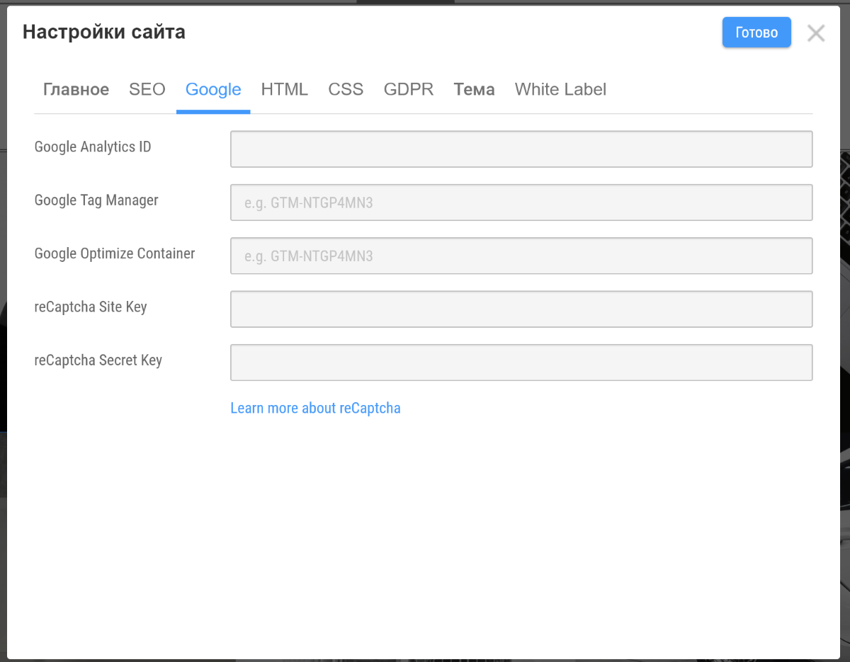 Здесь же можно настроить SEO вашего будущего сайта. Также можно указать теги аналитики, рекламы, капчи, соглашение об обработке данных и многое другое.