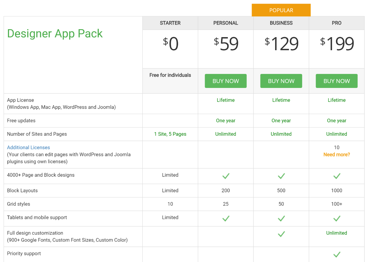 Есть два типа лицензий: 1 — с хостингом; 2 — без хостинга. Сами лицензии отличаются по количеству элементов, доступных для добавления в один сайт, и ещё нескольким функциям. По большому счёту лицензии за $59 хватит большинству пользователей.