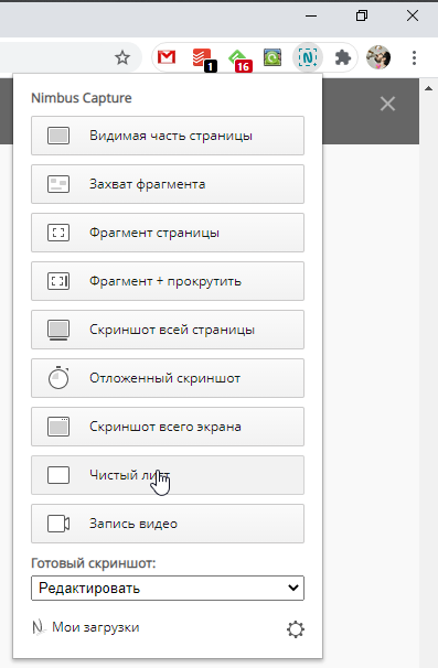 С помощью Nimbus Capture можно записать видео, сделать скриншот видимой части страницы, её фрагмента или всей страницы с прокруткой, отложенный скриншот.