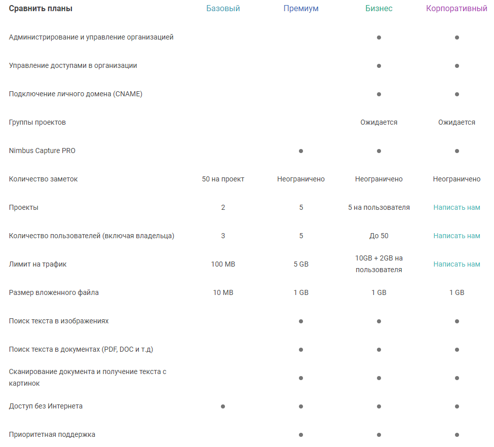 Цены на Nimbus Note зависят от количества пользователей и функций, которые вы хотите получить от сервиса. Базовая версия для 1-3 пользователей, из 50 заметок на проект, трафиком в 100 Мб и размером вложений в 10 Мб — бесплатно. Платная версия для домашних пользователей стоит 1000 рублей в год. Для бизнеса — 1500 в год.