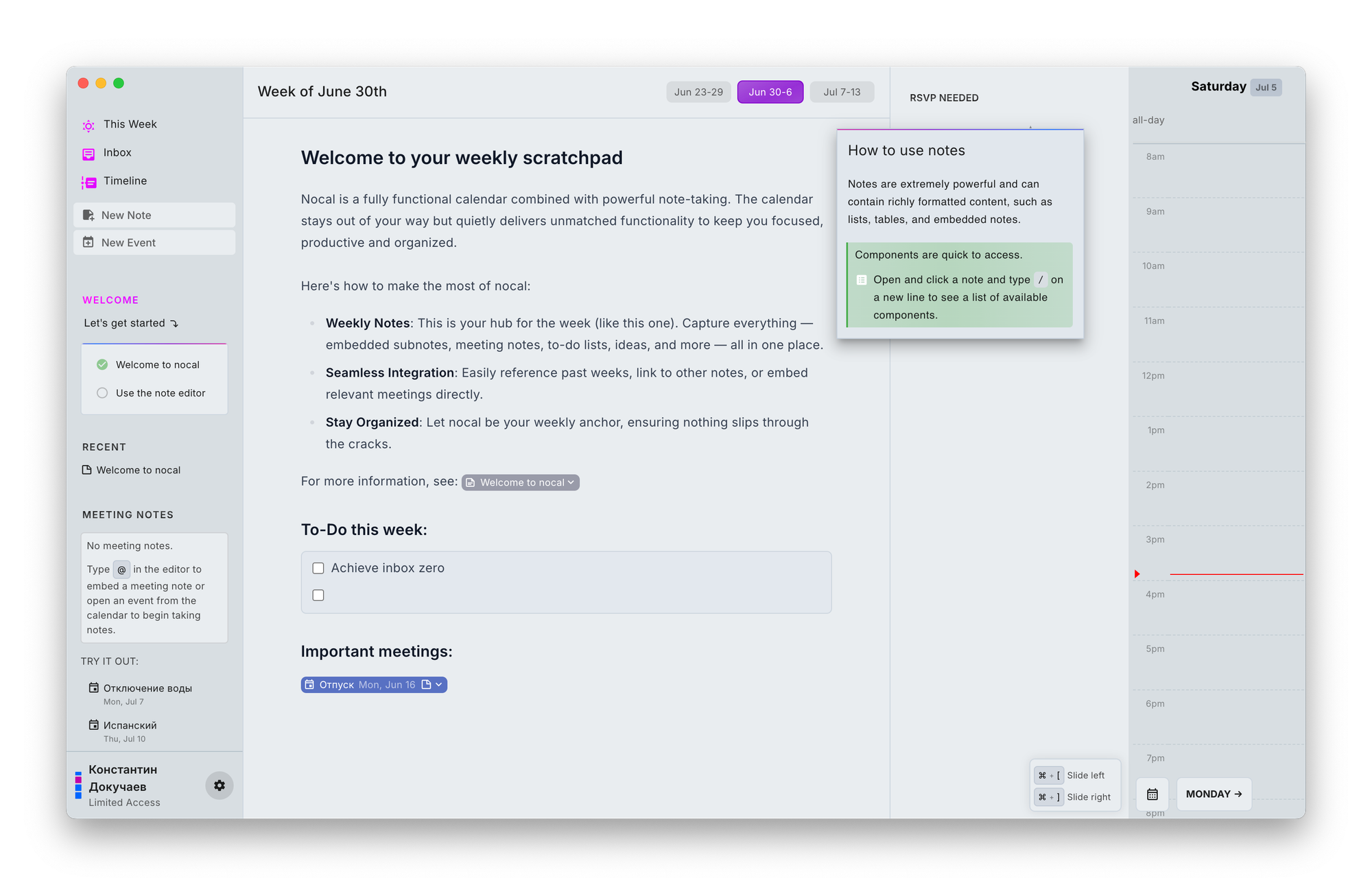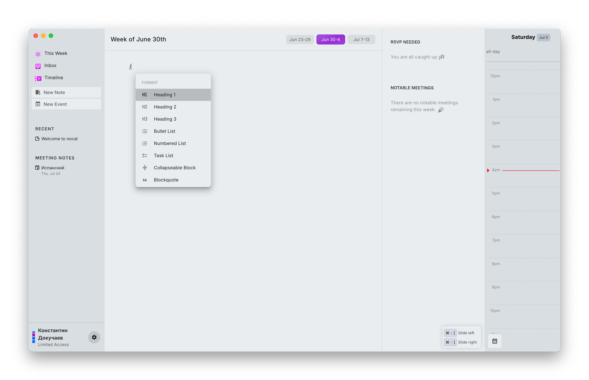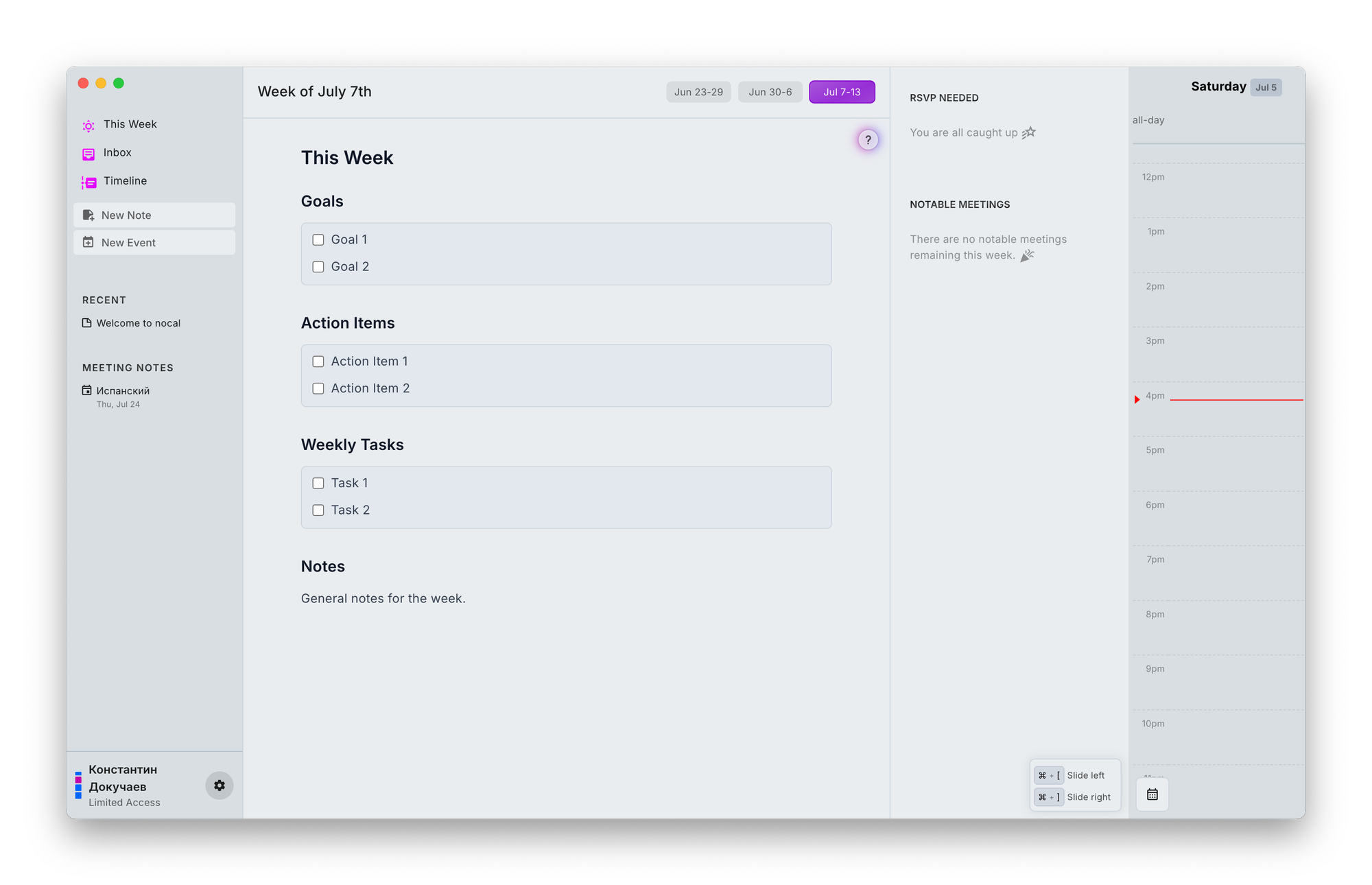 Сами заметки можно создавать с привязкой к мероприятию, к другим заметкам или планировать свою неделю в блоке This Week.