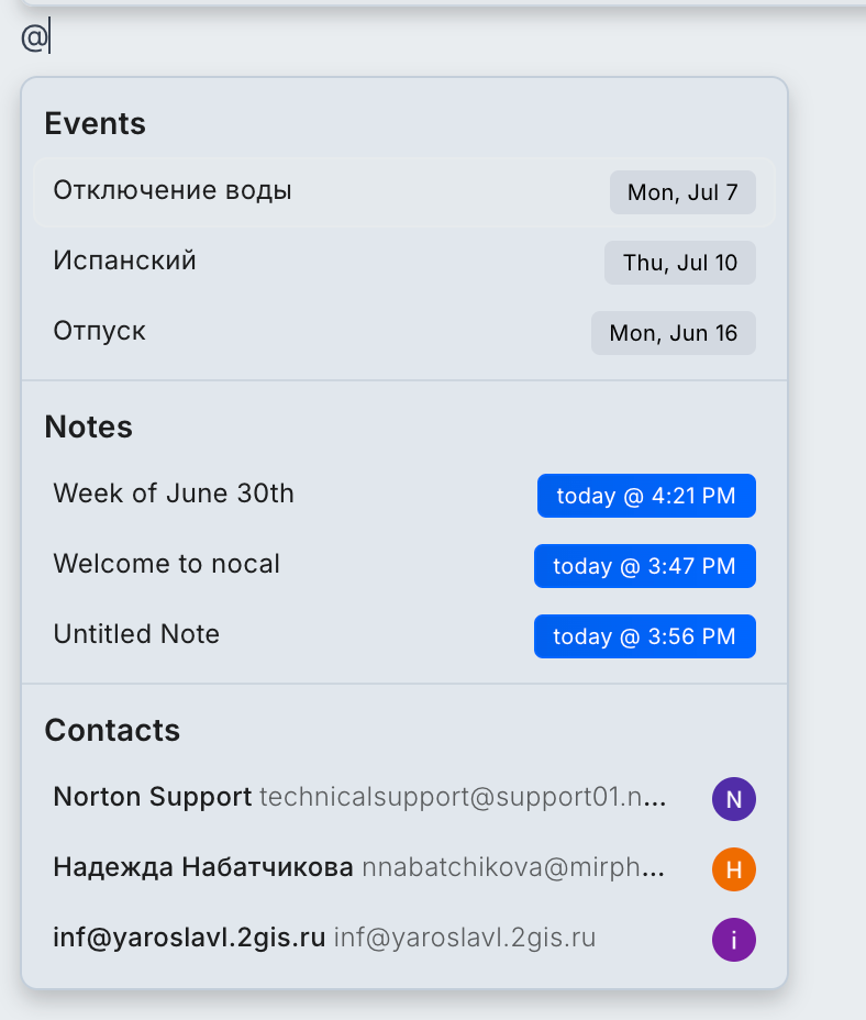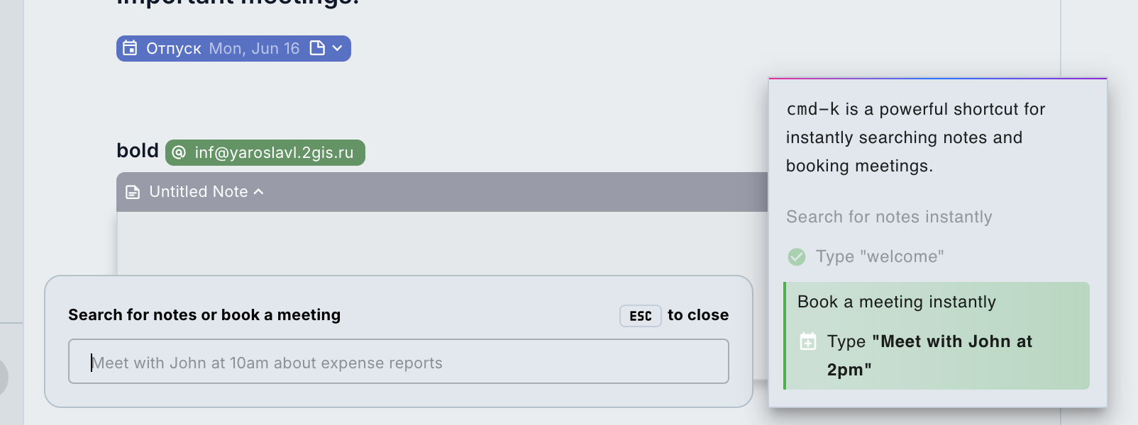 С помощью команд можно быстро создать встречу прямо из заметки и добавить в неё всё необходимое содержимое. Правда, русский nocal не понимает абсолютно. И чтобы создать встречу, придётся писать всё на английском. Зато к заметке можно добавить другую заметку.
