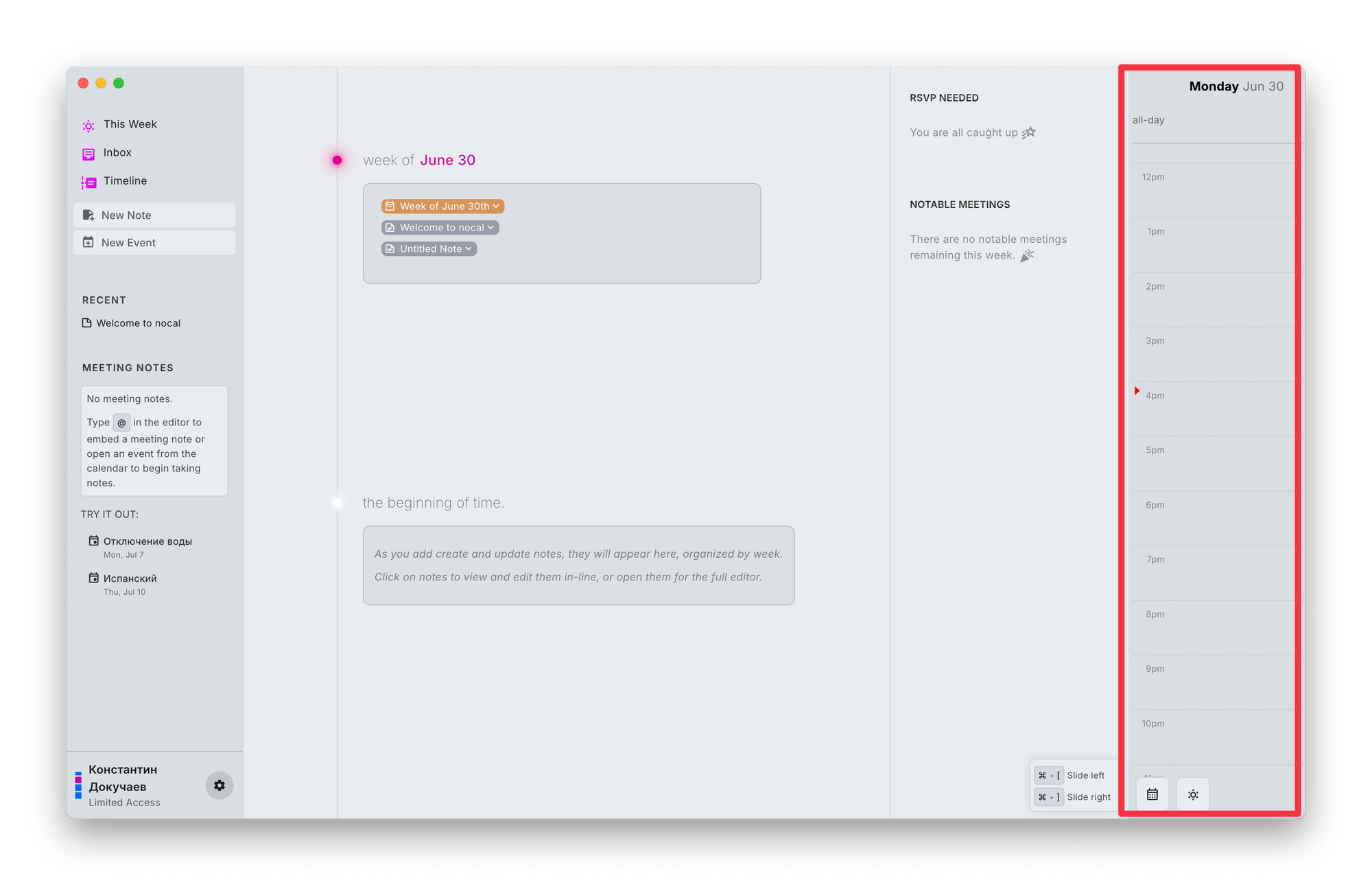 Если его пережить, вас ожидает приложение с панелью навигации (текущая неделя, входящие, таймлайн и заметки), просмотром выбранной категории и календарём.