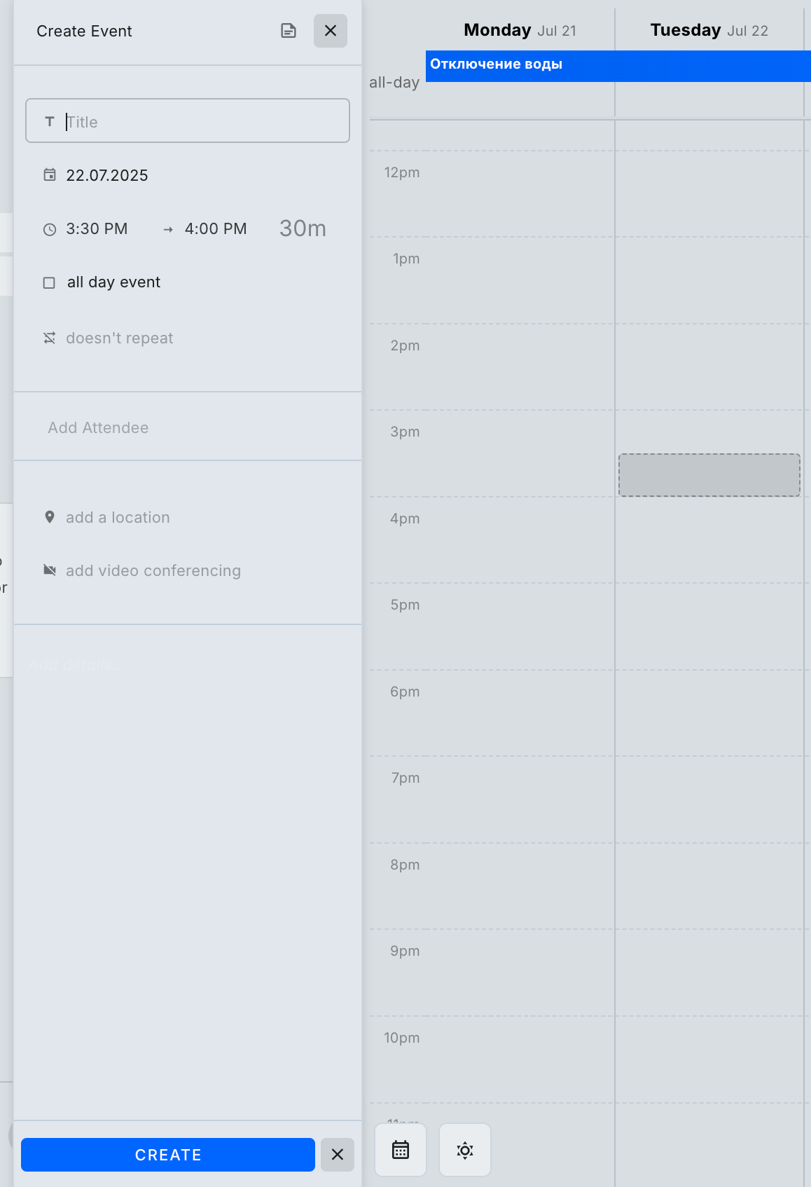 При клике на мероприятие или пустую область открывается его редактор. Тут в целом доступны все те же возможности, что и в Google: название, даты, повторяемость, адрес и ссылка для видеовстречи. Есть отдельная кнопка для создания заметки по мероприятию, но о заметках ниже.