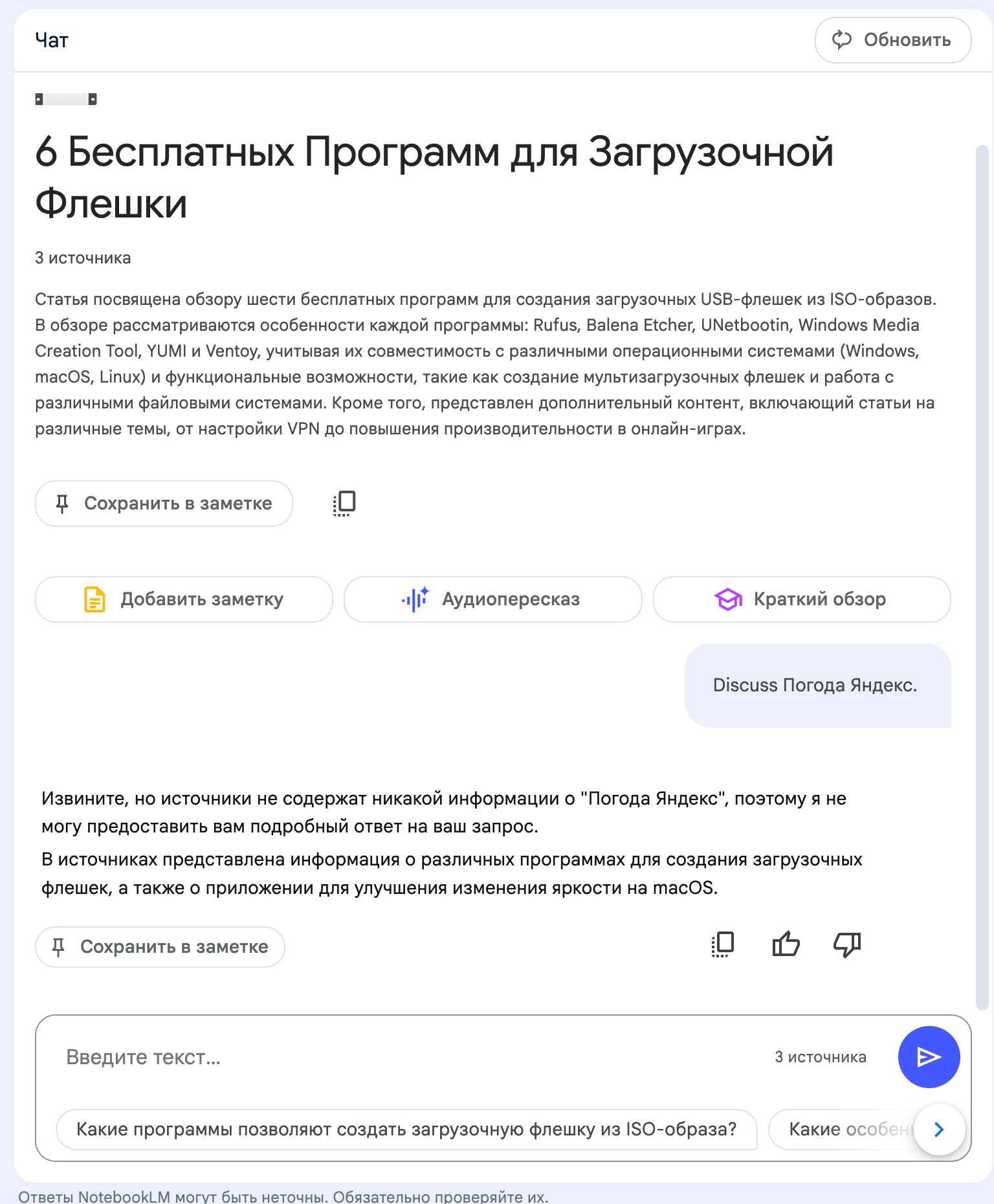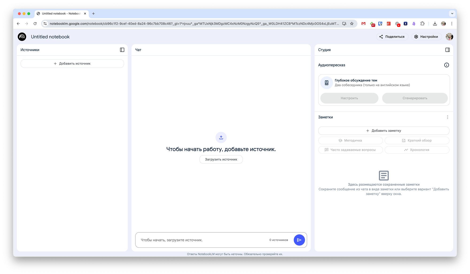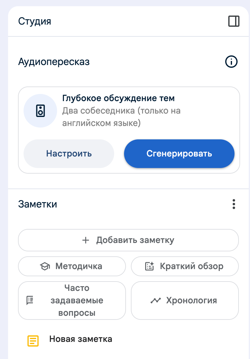 Почти все возможности NotebookLM доступны на русском языке, и это круто. Полезность сервиса как аналога Notion или Obsidian сомнительна.