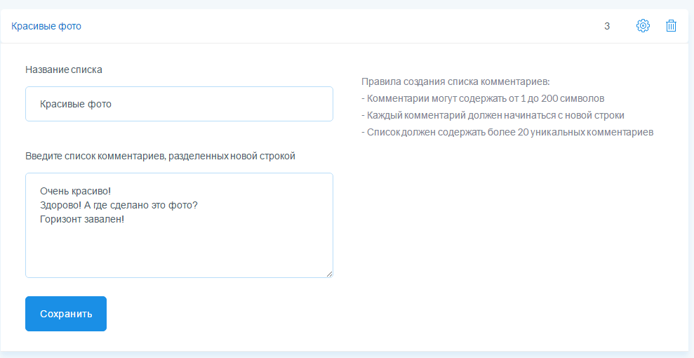 После запуска задачи Instaplus автоматически будет оставлять случайный комментарий из списка.