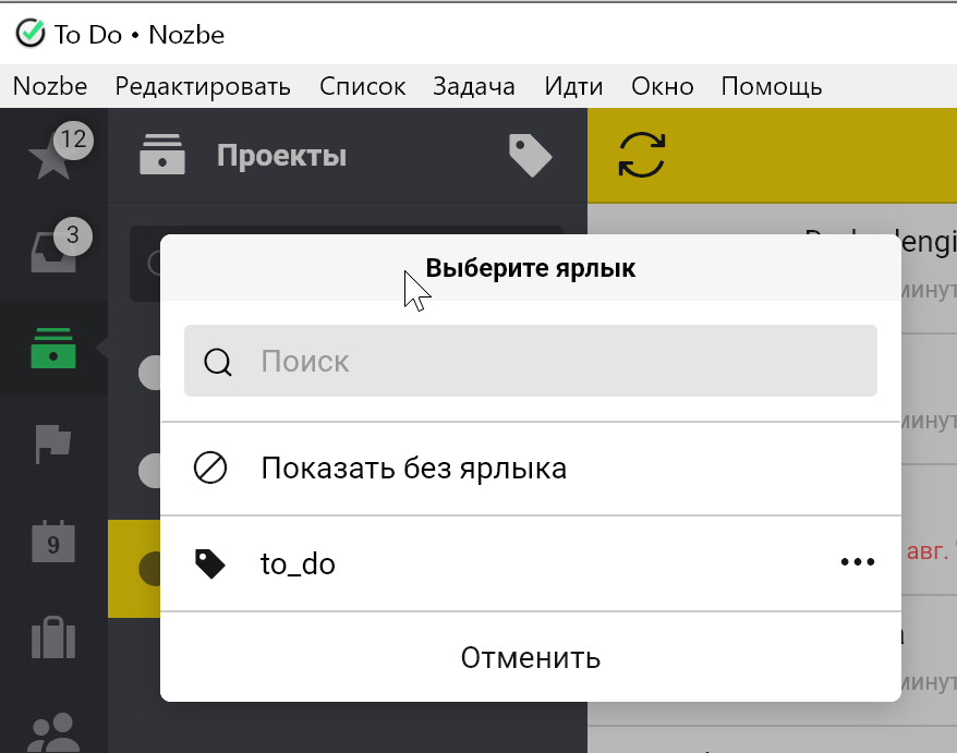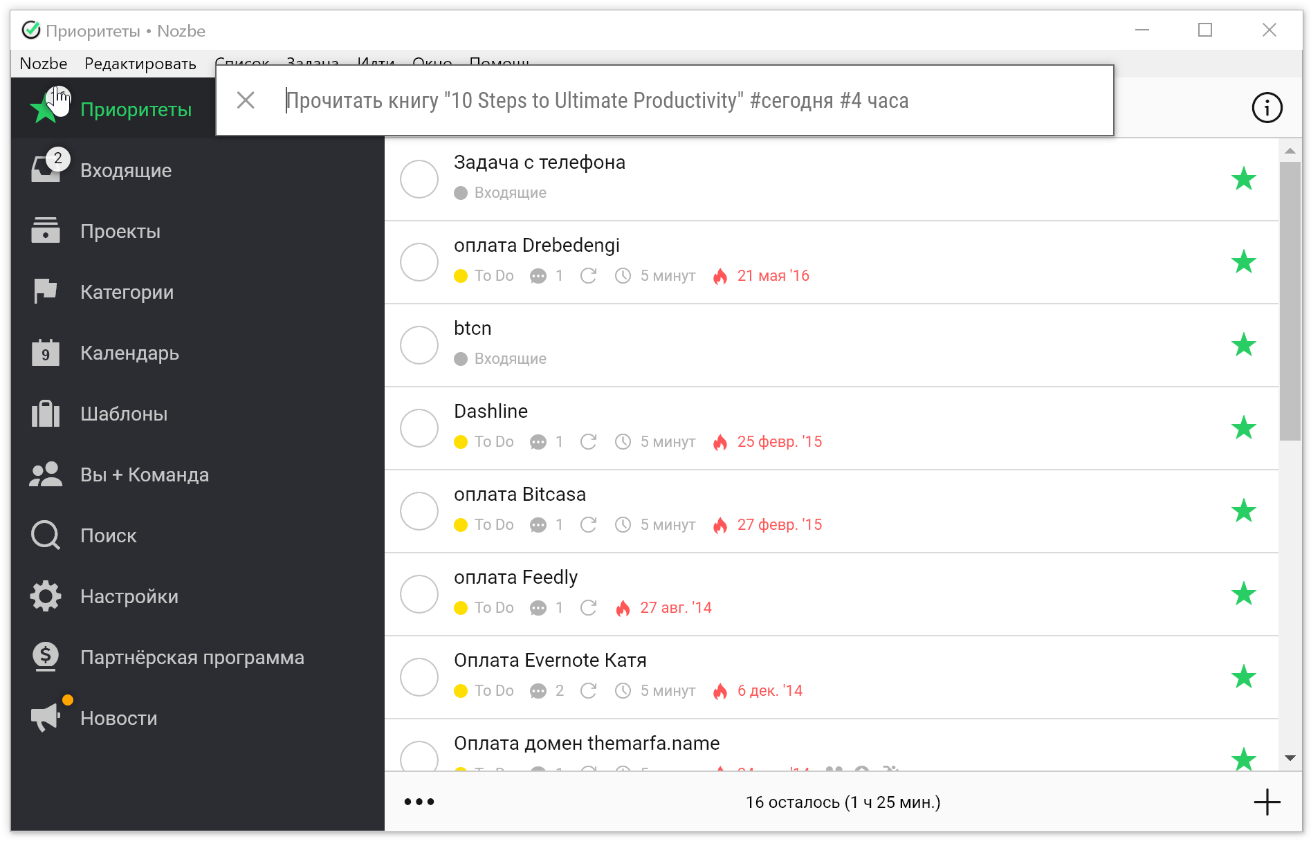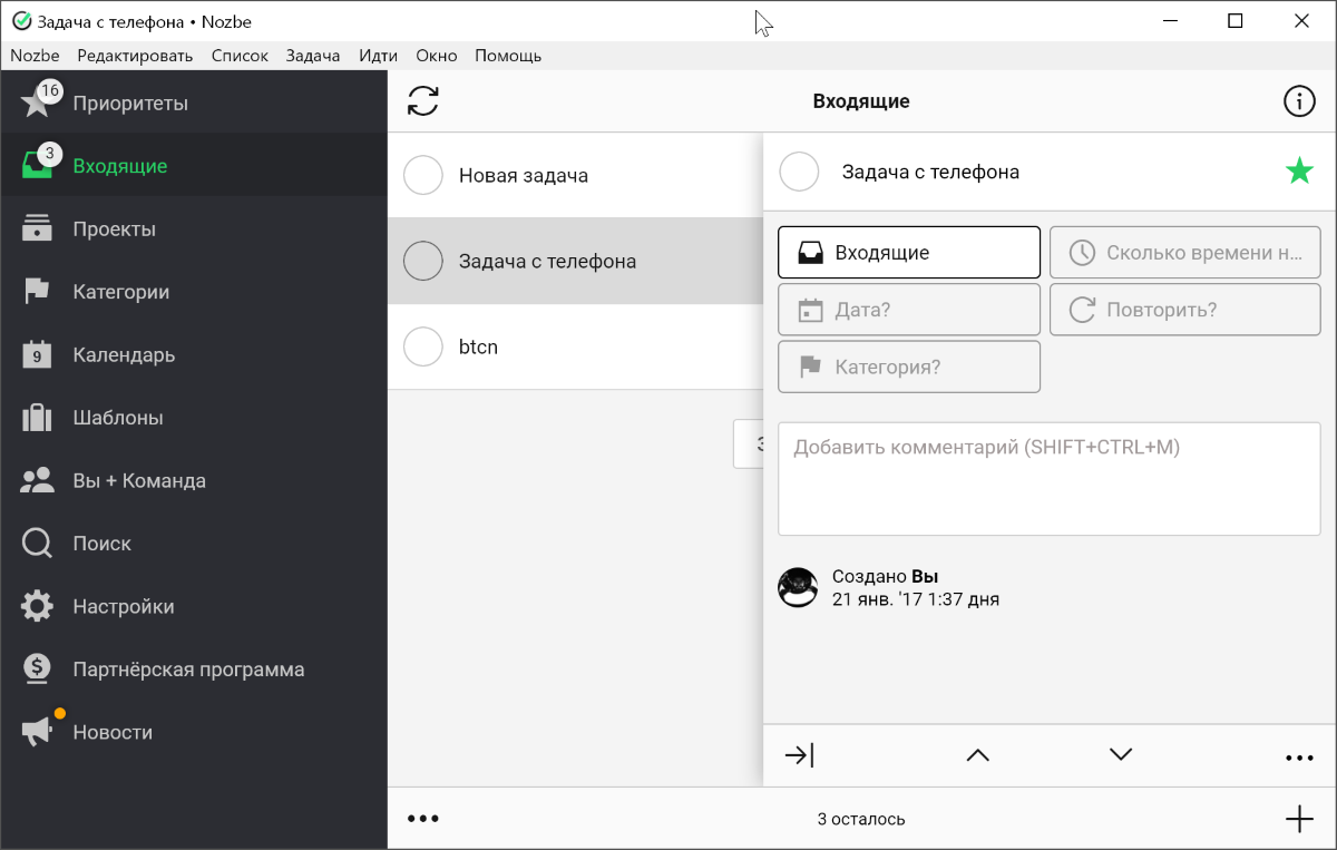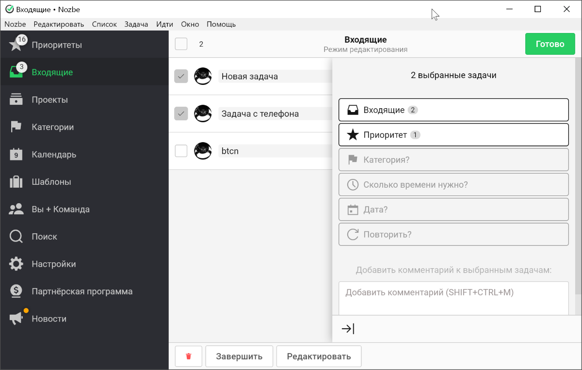 Я предпочитаю собирать задачи в папке Входящие и утром разбирать их по проектам. При клике на задачу (в любом проекте) открывается привычное окно для редактирования.