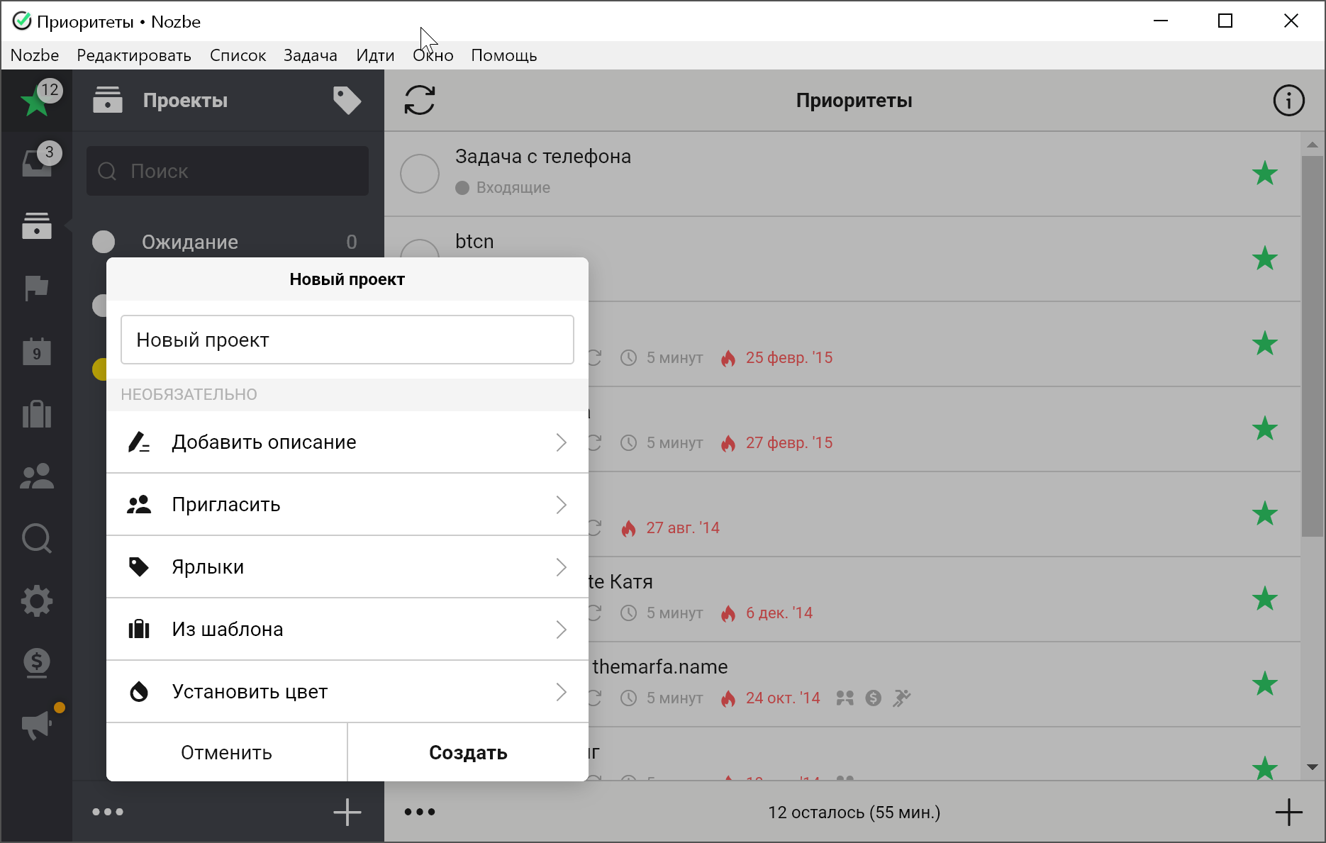 Кроме названия, проекту можно добавить текстовое описание, добавить в него коллег, выбрать ярлыки, цвет. Проекты также можно создавать из готовых шаблонов.