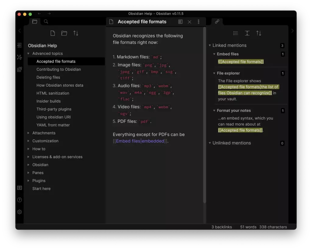 Ссылки и обратные ссылки: В данном случае ссылки — ваши заметки, из которых будет формироваться целая сеть связанных идей. Создать такую ссылку можно с помощью того же Markdown. Что касается обратных ссылок, то они генерируются автоматически и сразу же отображаются на боковой панели. Там же вы увидите несвязанные упоминания. Чтобы перейти по ссылке, кликните по ней в режиме предпросмотра или удерживайте клавишу Command в режиме редактирования. Для возврата назад используйте комбинацию Command + Option + стрелочка влево.