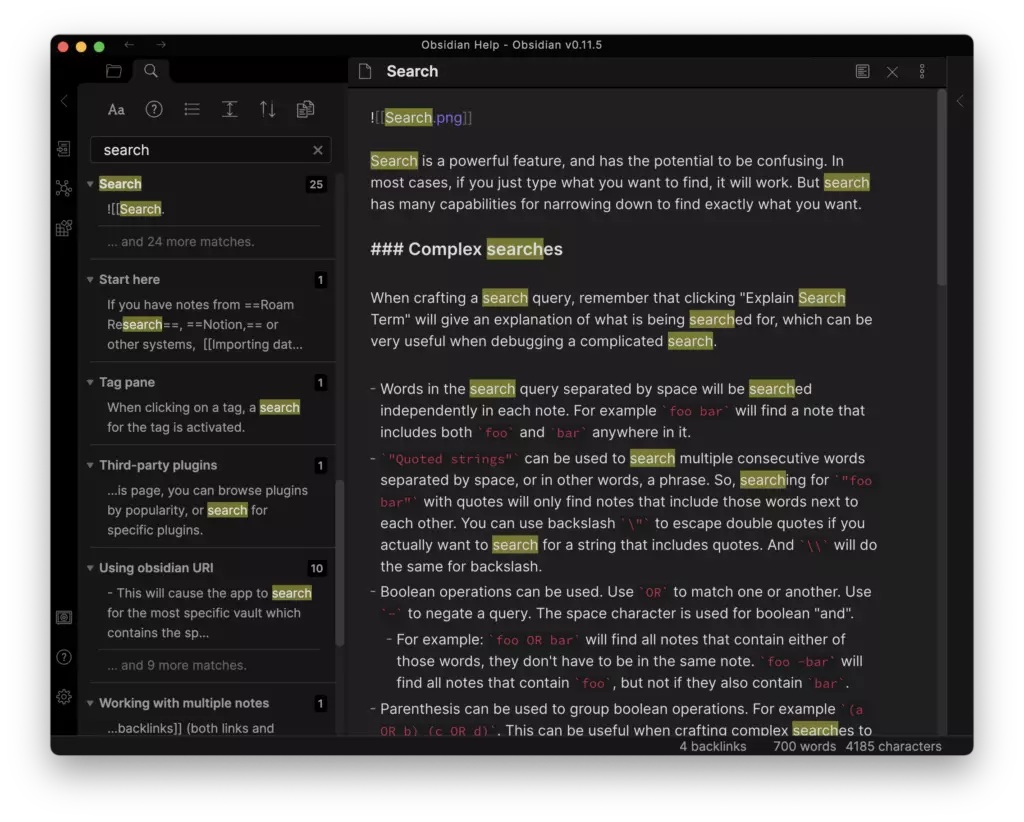 Плагины: На данный момент в приложении есть 22 плагина, среди них — обратные ссылки, графический вид, поиск, ежедневные заметки, шаблоны и др.