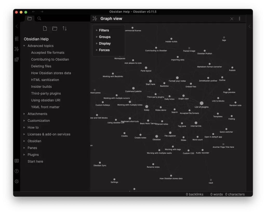 Графический вид: Здесь вы сможете увидеть все переплетения ваших заметок. Наведите курсор на заметку, чтобы увидеть все связанные с ней заметки (они подсветятся фиолетовым цветом).