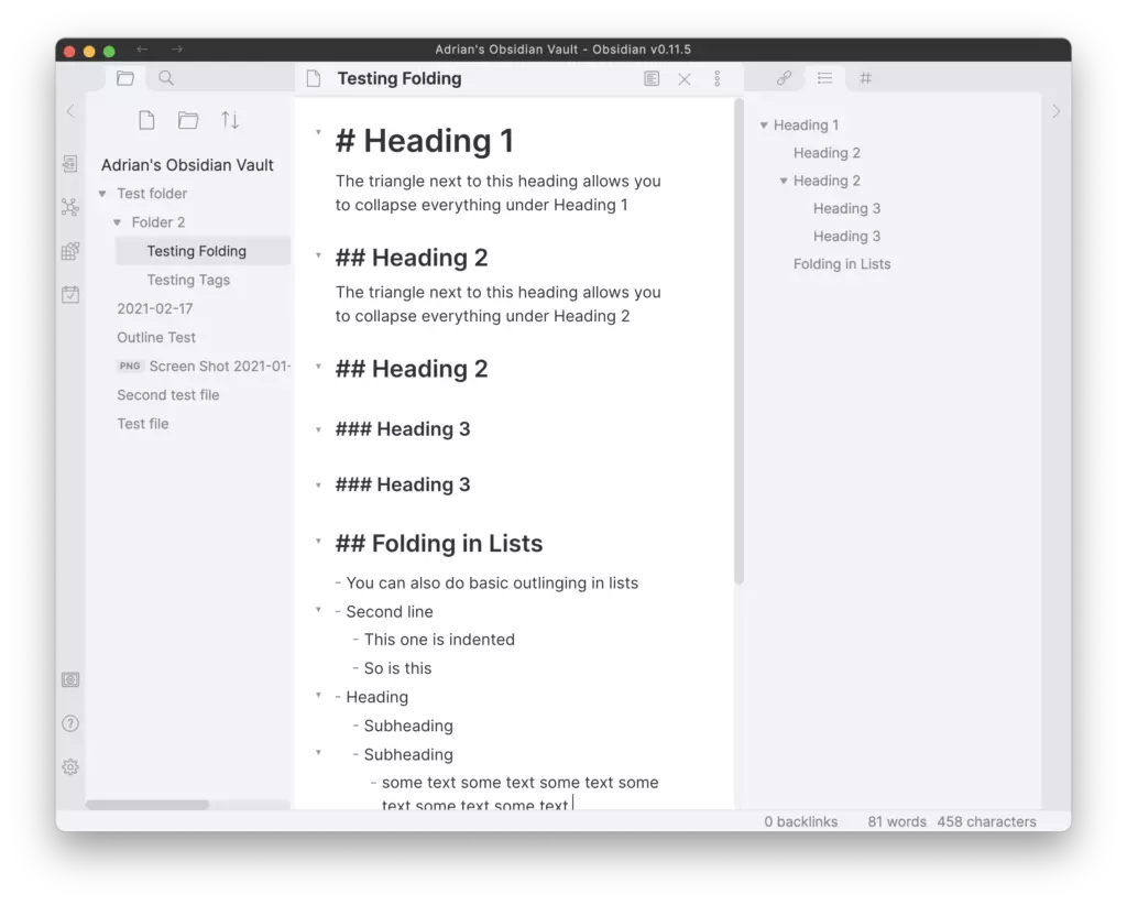 Сворачивание: Покопавшись в настройках, вы найдёте удобную штуку, которая позволит сворачивать и разворачивать заголовки и/или абзацы. Также есть плагин Outline, подключив который вы будете видеть все свои заголовки на боковой панели.