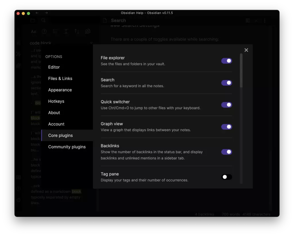 Поскольку в Obsidian очень много функций (некоторые даже рассчитаны на более продвинутых пользователей), логично, что какие-то из них вам вообще будут не нужны. И круто, что всё лишнее можно отключить, оставив только самое необходимое.