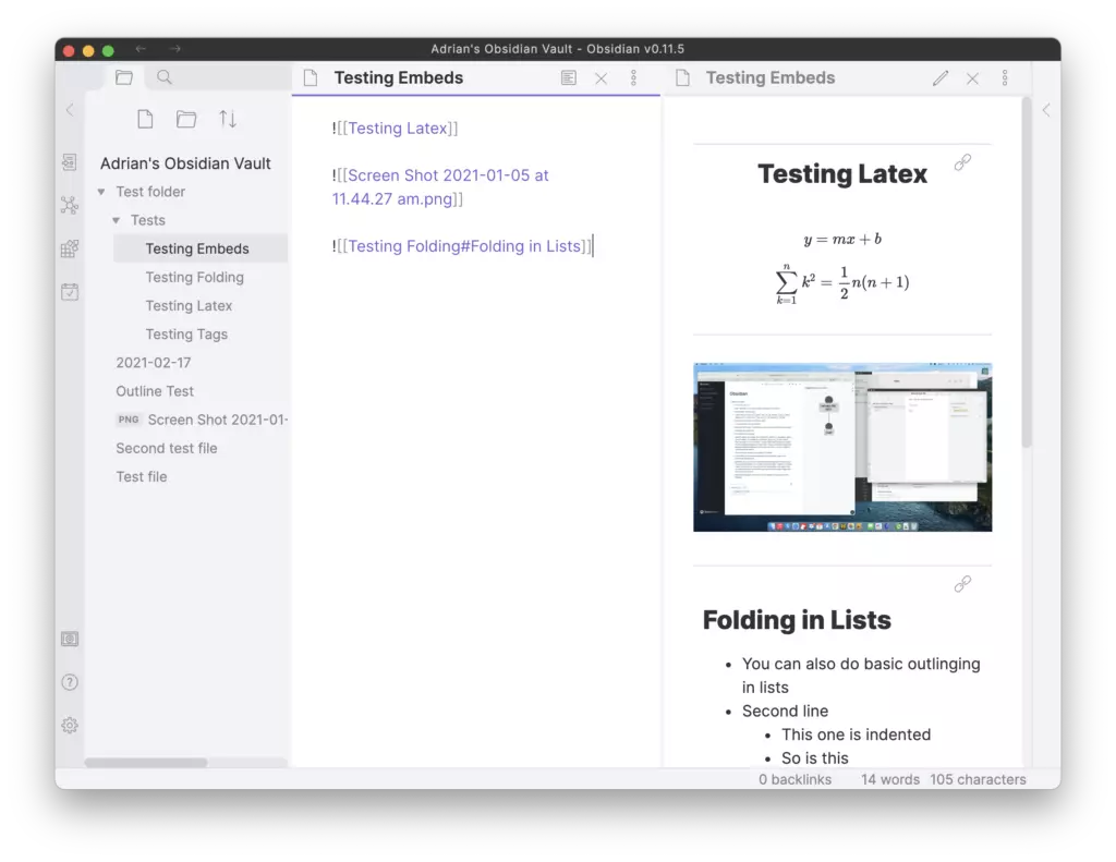 Вложения: Вы можете добавлять свои заметки или файлы, используя вот такую разметку ![[filename]]. Такая же функция есть и для голосовых заметок, но для этого потребуется подключить плагин для аудиозаписи.