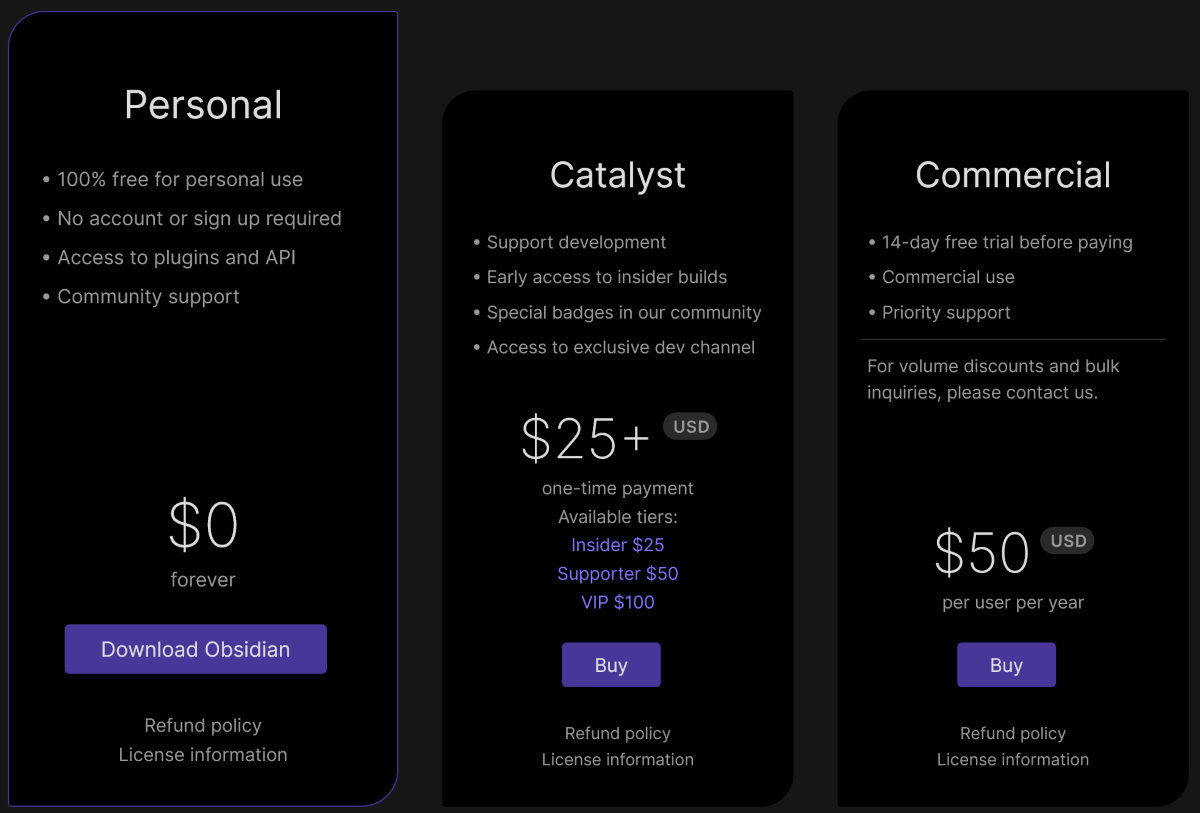 Для личного пользования Obsidian доступен абсолютно бесплатно, но также есть несколько вариантов использования, при которых от вас потребуют денежку: