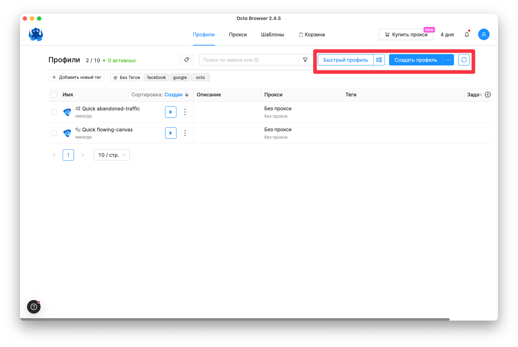 Есть два способа создавать профили. Быстрый, где от вас требуется выбрать только операционную систему и нажать кнопку создания.