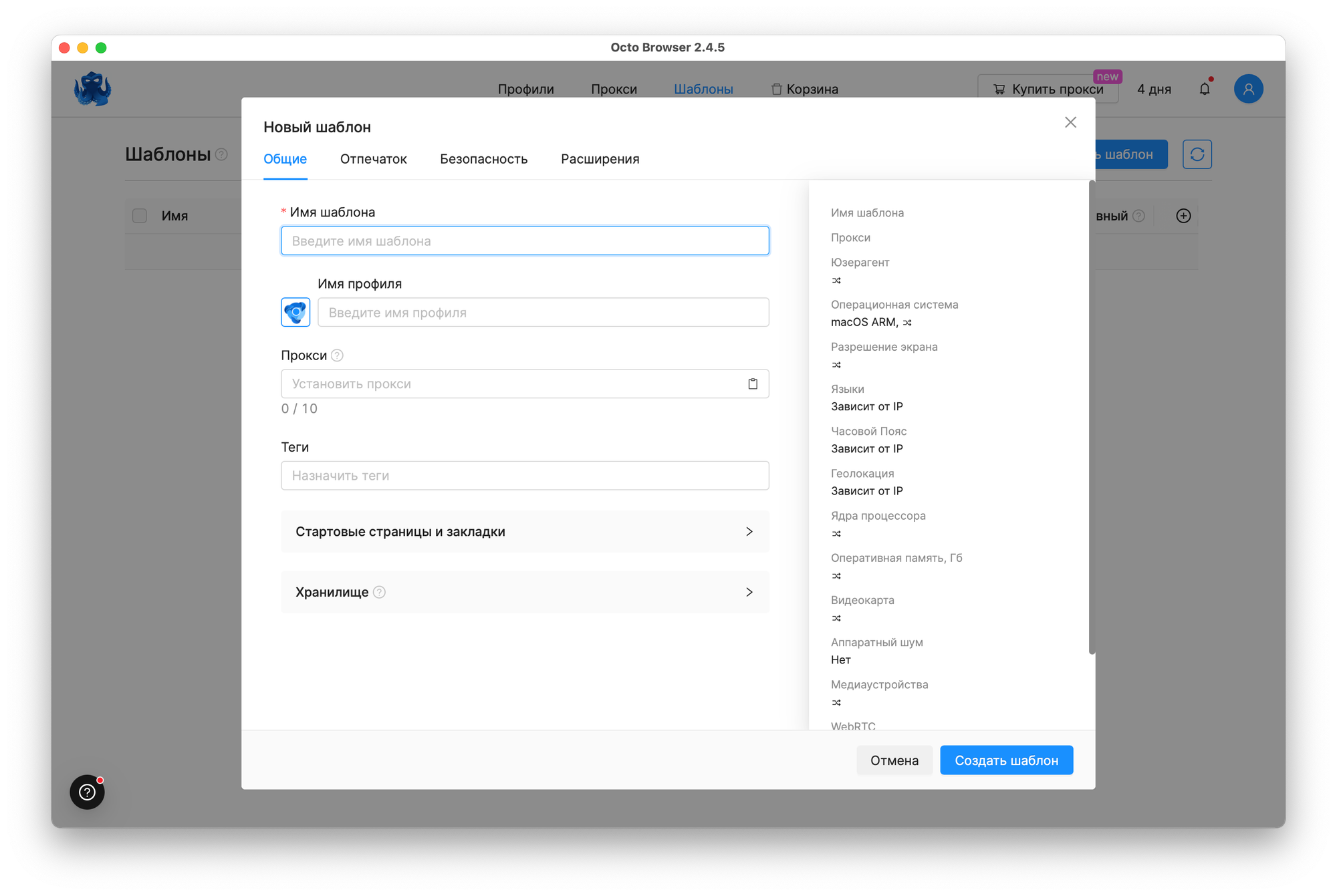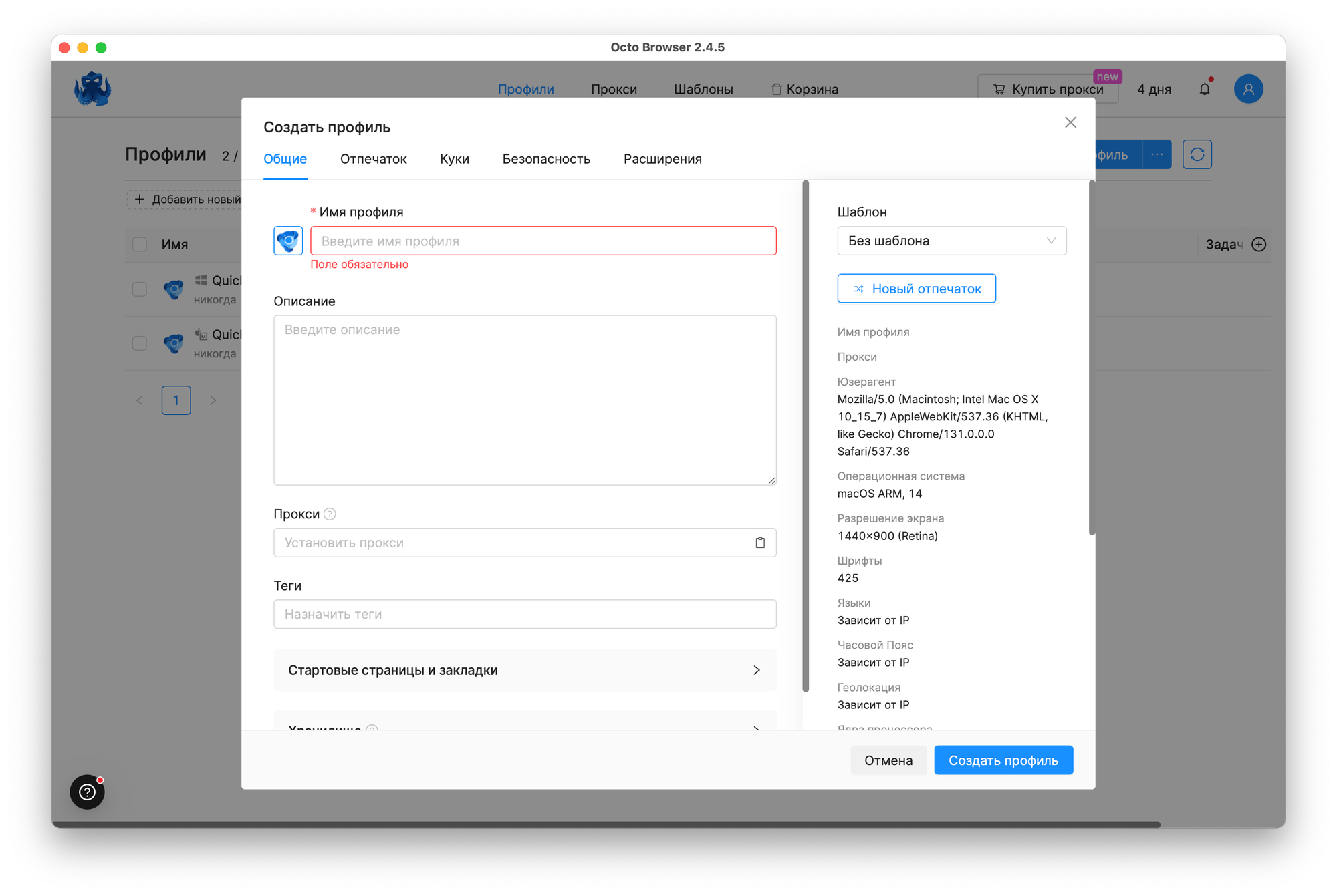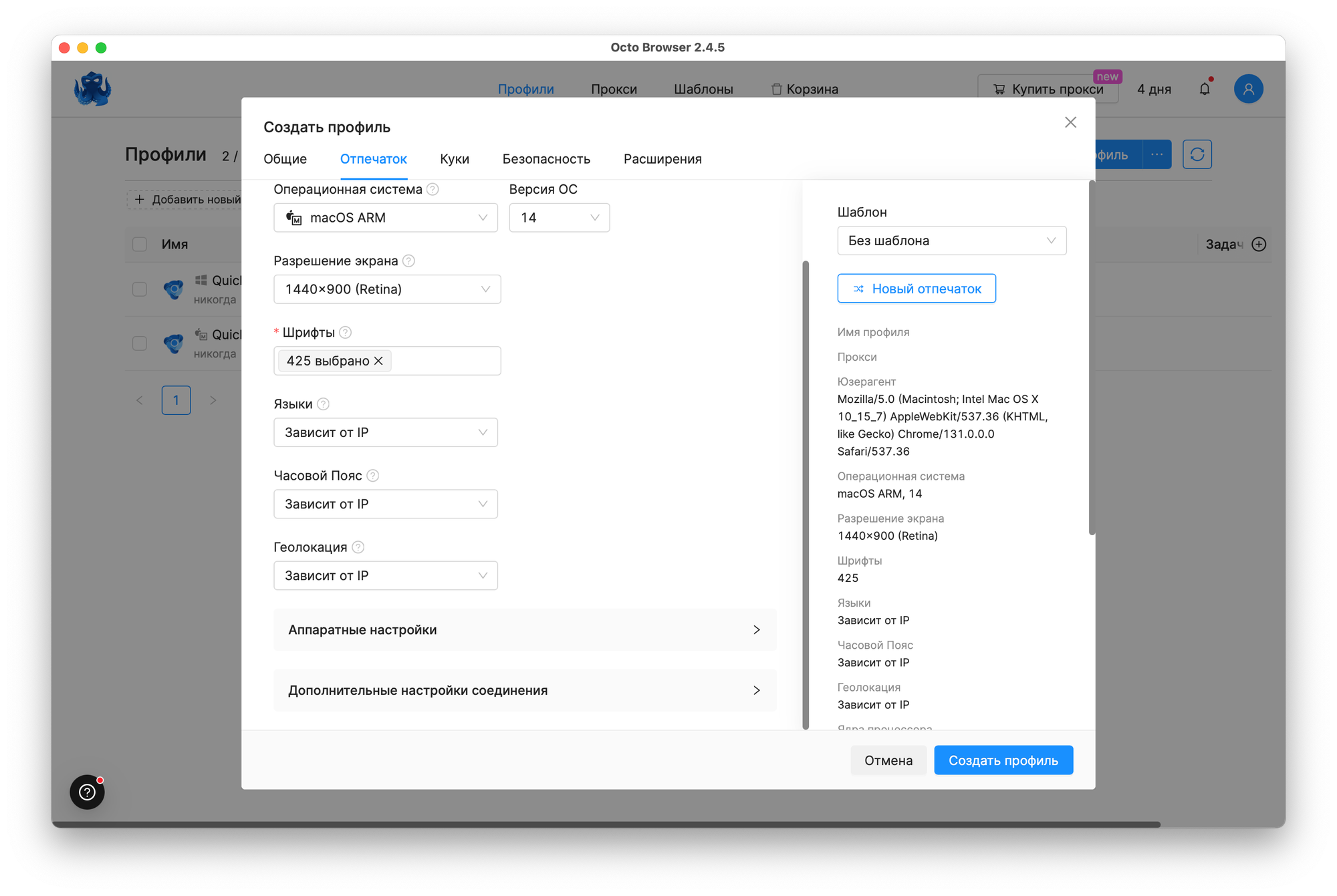 Отдельно в этой настройке хочу выделить возможность ручной настройки отпечатка браузера и импорта куков. С импортом, думаю, всё понятно. А вот возможности настройки отпечатка позволяют указать все необходимые параметры вашего браузера — от операционной системы до аппаратных настроек.